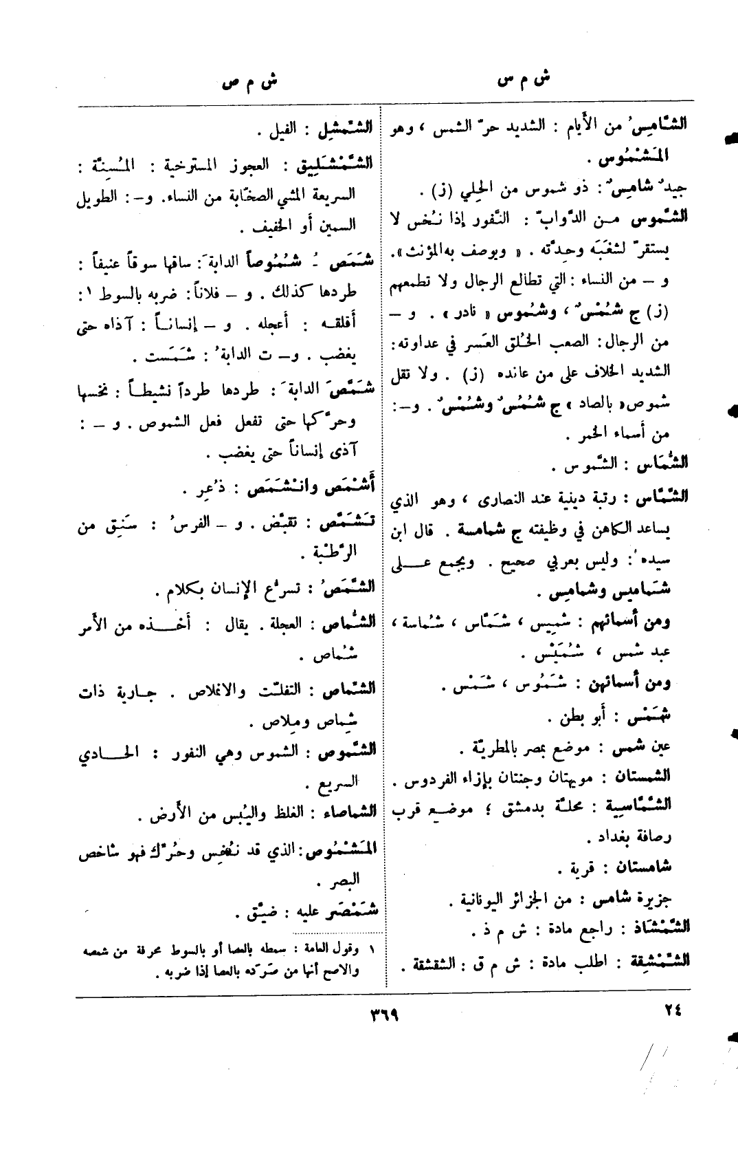 شمس: شموصاً الدابة: ساقها سوقاً عنيفاً: طردها كذلك. و- فلاناً: ضربه بالسوط (¬1): أقلقه: أعجله. و- إنساناً: آذاه حتى يغضب. و- ت الدابة: شمست.