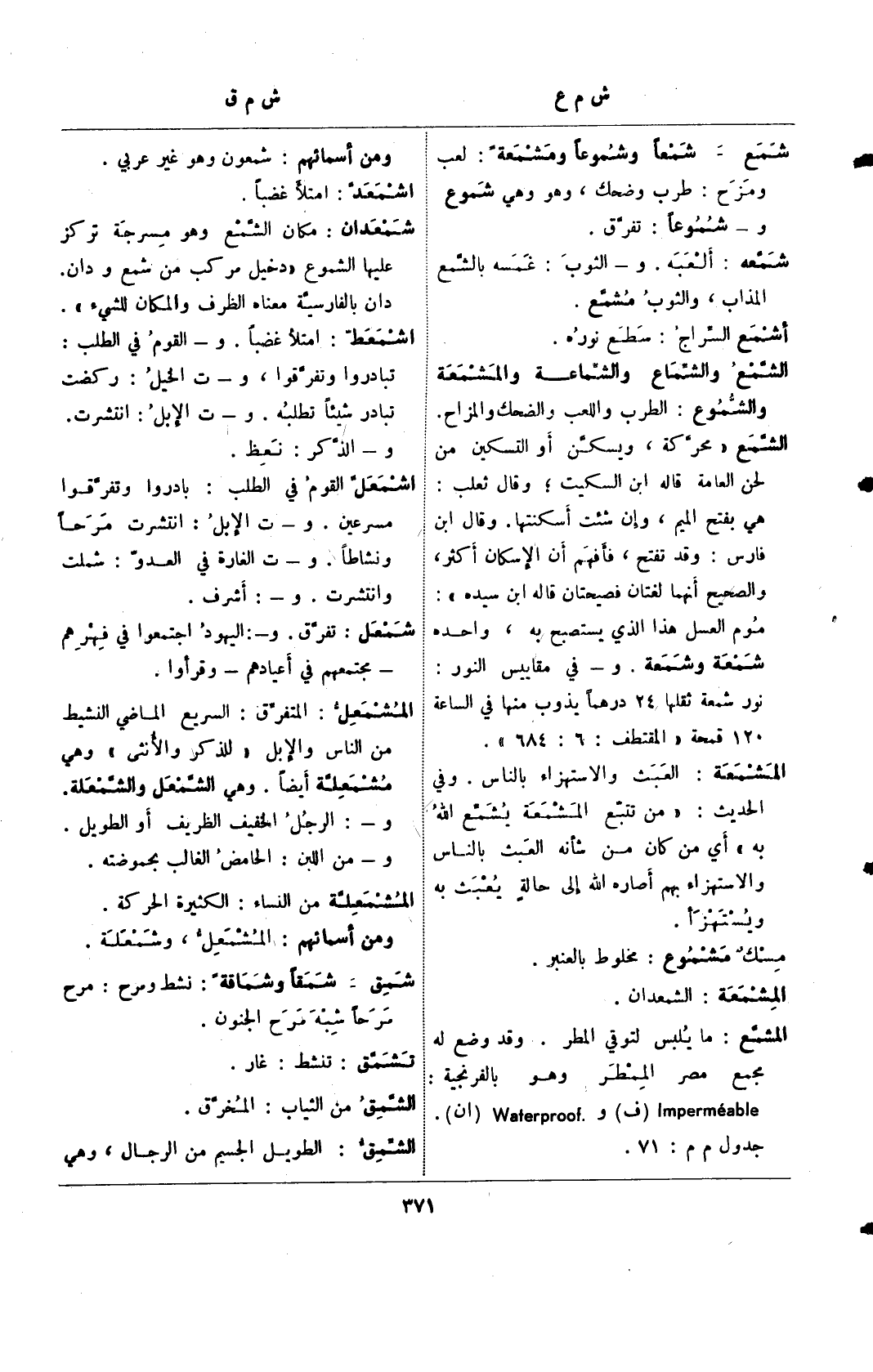 الشمع والشماع والشماعة والمشمعة والشموع: الطرب واللعب والضحك والمزاح. الشمع "محركة، ويسكن أو التسكين من لحن العامة قاله ابن السكيت؛ وقال ثعلب: هي يفتح الميم، وإن شئت أسكنتها. وقال ابن فارس: وقد تفتح، فأفهم أن الإسكان أكثر والصحيح أنهما لغتان فصيحتان قاله ابن سيده": موم العسل هذا الذي يستصبح به، واحده شمعة وشمعة. و- في مقاييس النور: نور شمعة ثقلها 24 درهماً يذوب منها في الساعة 120 قمحة "المقتطف: 6: 684".