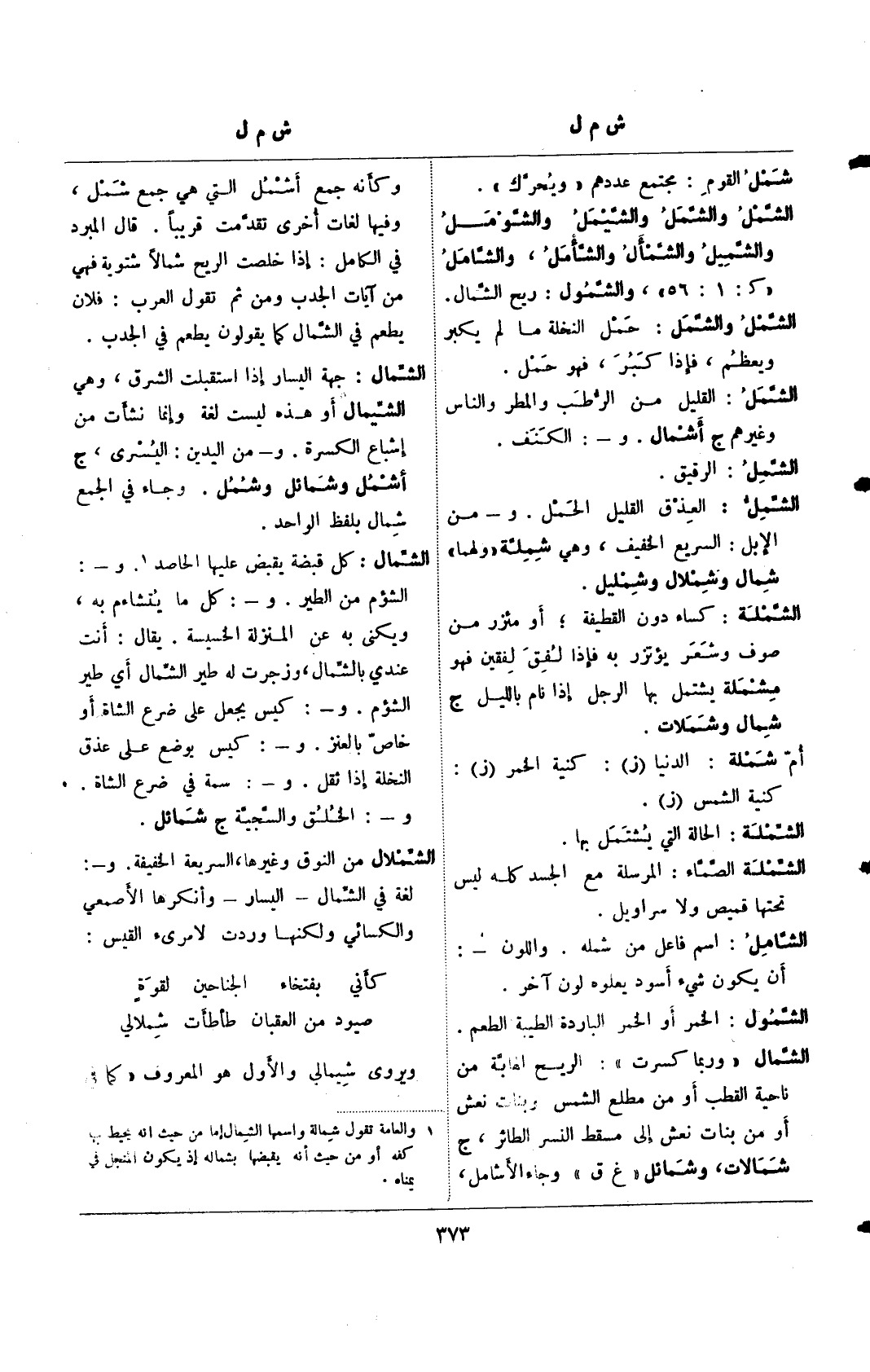 الشمال "وربما كسرت": الريح الهابة من ناحية القطب أو من مطلع الشمس وبنات نعش أو من بنات نعش إلى مسقط النسر الطائر، ج شمالات، وشمائل "غ ق" وجاء الأشامل،
