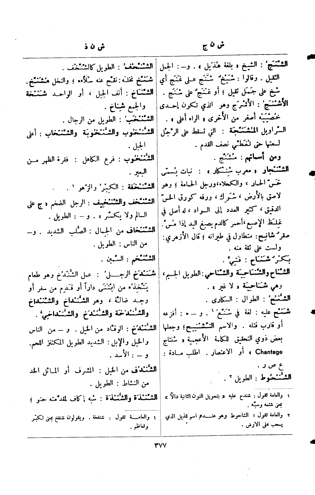 شنح عليه: لغة في شنع (¬1). و- هـ: أفزعه أو قارب قتله. والاسم التشنيح؛ وجعلها بعض ذوي التحقيق للكلمة الأعجمية "شنتاج Chantage" أو الاعتصار. اطلب مادة: ع ص ر.