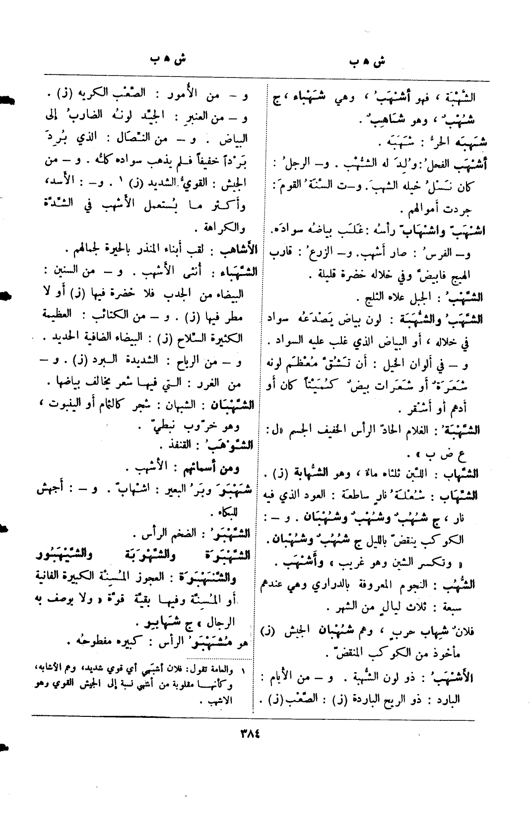 الشهاب: شعلة نار ساطعة: العود الذي فيه نار، ج شهب وشهب وشهبان. و-: الكوكب ينقض بالليل ج شهب وشهبان. "وتكسر الشين وهو غريب" وأشهب الشهب: النجوم المعروفة بالدراري وهي عندهم سبعة: ثلاث ليالٍ من الشهر.
