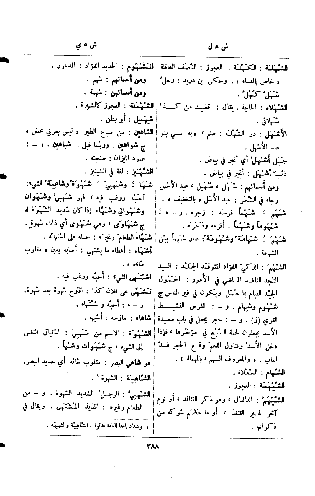 شها: وشهي: شهوة وشاهية الشيء: أحبه ورغب فيه، فهوشهي وشهوان وشهواني وشهاء إذا كان شديد الشهوة له ج شهاوي، وهي شهوى أي ذات شهوةٍ.