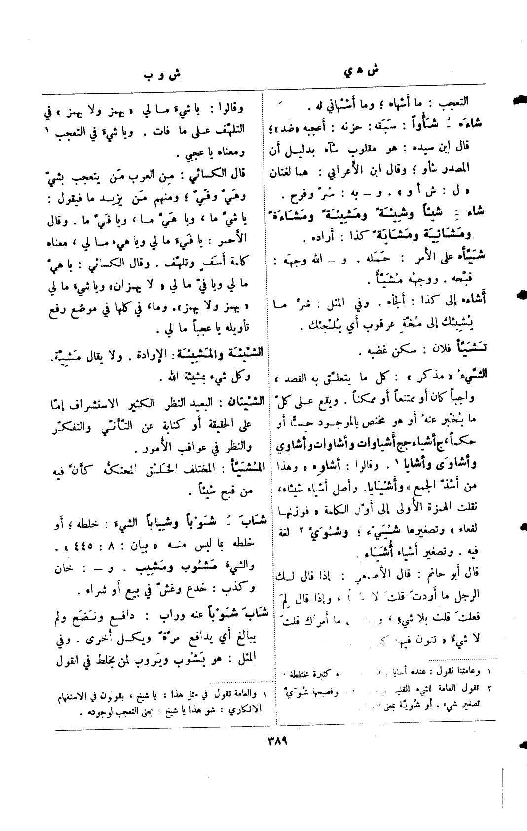 الشيء "مذكر": كل ما يتعلق به القصد، واجباً كان أو ممتنعاً أو ممكناً. ويقع على كل ما يخبر عنه أو هو مختص بالموجود حسًا أو حكماً، ج أشياء جج أشياوات وأشاوات وأشاوي وأشاوي وأشايا (¬1). وقالوا: أشاوه "وهذا من أشذ الجمع" وأشيايا. وأصل أشياء شيئاء، نقلت الهمزة الأولى إلى أول الكلمة "فوزنها لفعاء" وتصغيرها شيء؛ وشوي (¬2) لغة فيه. وتصغير أشياء أشياء.