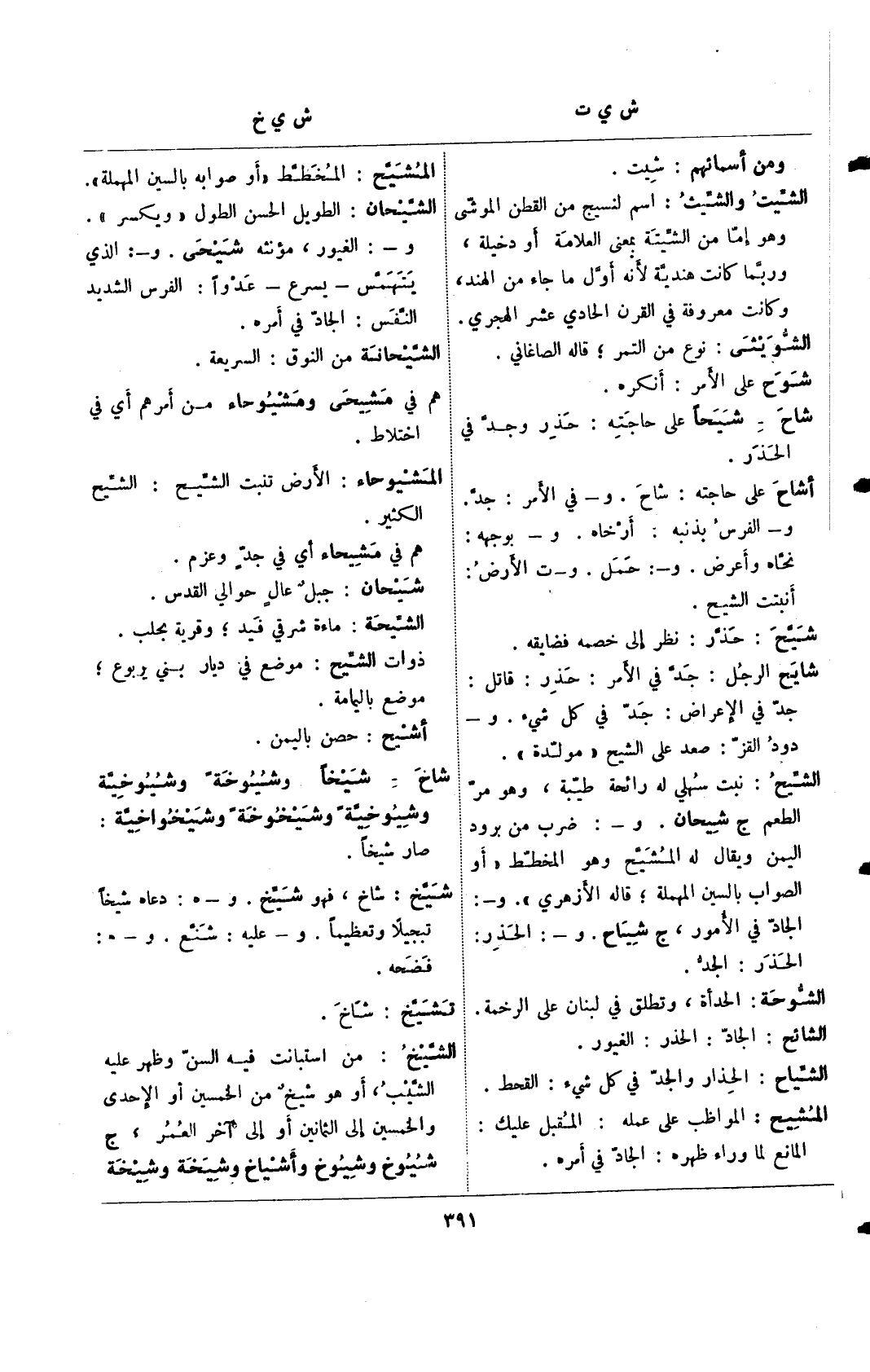 الشيح: نبت سهلي له رائحة طيبة، وهو مر الطعم ج شيحان. و-: ضرب من برود اليمن ويقال له المشيح وهو المخلط "أو الصواب بالسين المهملة؛ قاله الأزهري". و-: الجاد في الأمور، ج شياح. و-: الحذر: الحذر: الجد.