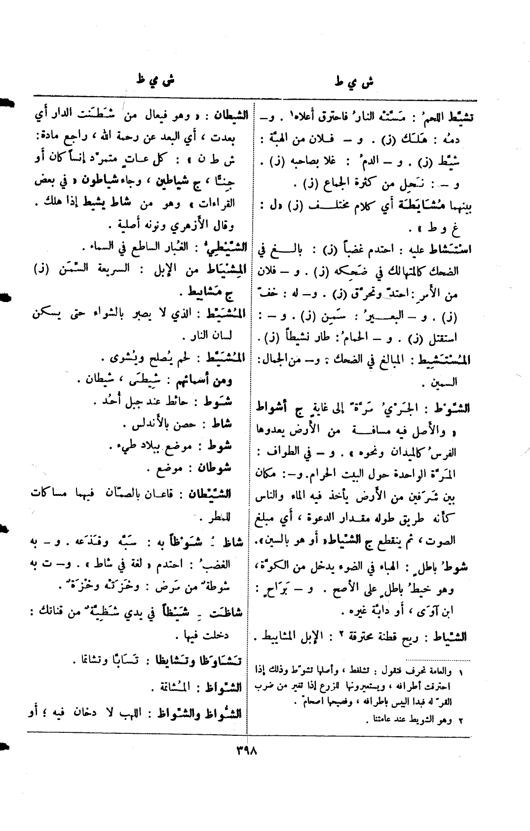 الشيطان: "وهو فيعال من شطنت الدار أي بعدت، أي البعد عن رحمة الله، راجع مادة: ش ط ن": كل عاتٍ متمرد إنساً كان أو جناً، ج شياطين، وجاء شياطون "في بعض القرارات" وهو من شاط يشيط إذا هلك.