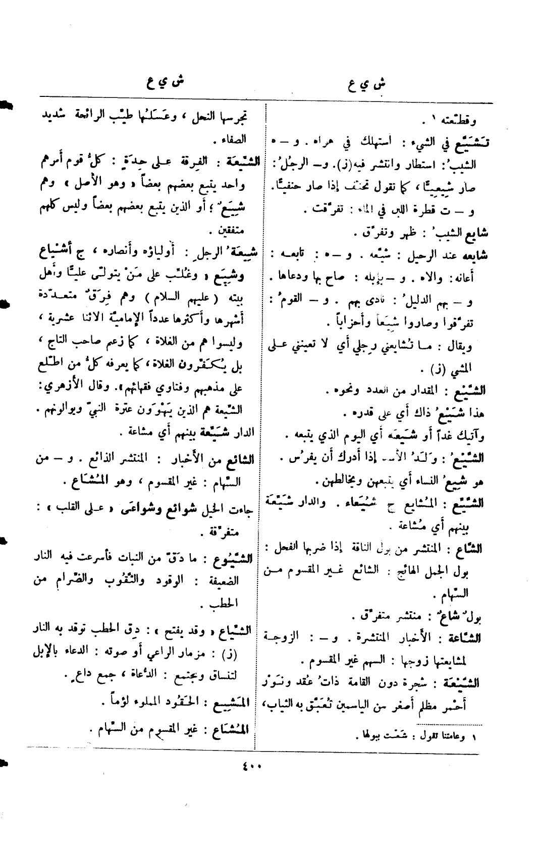 الشيعة: الفرقة على حدةٍ: كل قوم أمرهم واحد يتبع بعضهم بعضاً "وهو الأصل" وهم شيع؛ أو الذين يتبع بعضهم بعضاً وليس كلهم متفقين.