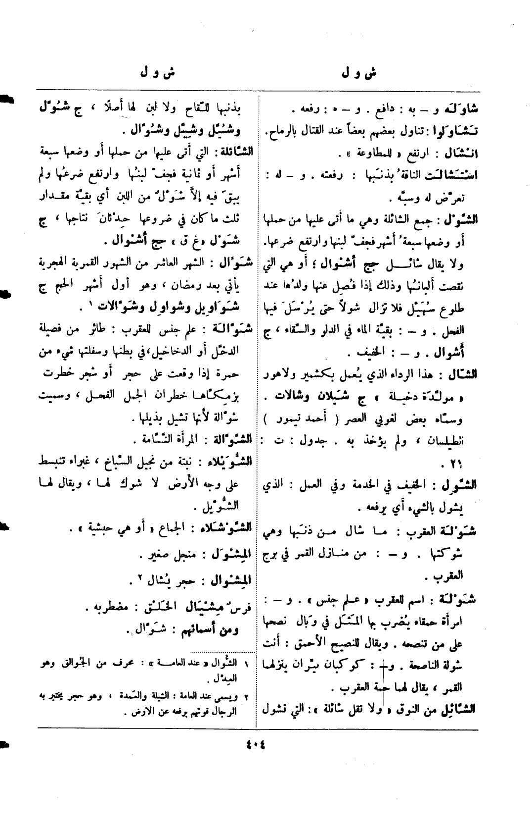 الشول: جمع الشائلة وهي ما أتى عليها من حملها أو وضعها سبعة أشهر فيجف لبنها وارتفع ضرعها. ولا يقال شائل جج أشوال؛ أو هي التي نقصت ألبانها وذلك إذا فُصل عنها ولدها عند طلوع سهيل فلا تزال شولًا حتى يرسل فيها الفحل. و-: بقية الماء في الدلو والسقاء، ج أشوال. و-: الخفيف.