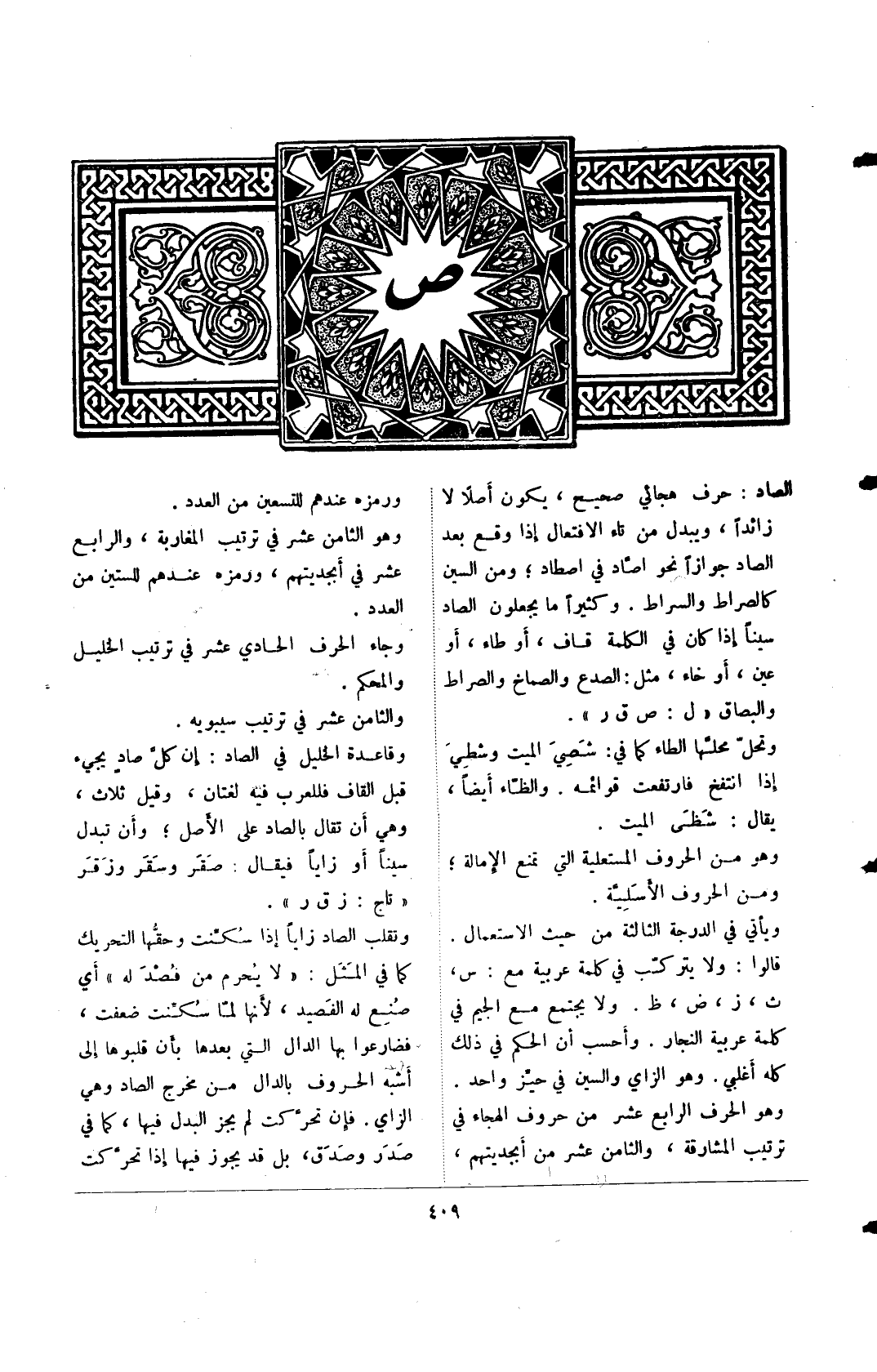 الصاد: حرف هجائي صحيح، يكون أصلًا لا زائدًا، ويبدل من تاء الافتعال إذا وقع بعد الصاد جوازًا نحو اصاد في اصطاد؛ ومن السين كالصراط والسراط. وكثيرًا ما يجعلون الصاد سينًا إذا كان في الكلمة قاف، أو طاء، أو عين، أو خاء، مثل: الصدع والصماخ والصراط والبصاق "ل: ص ق ر".