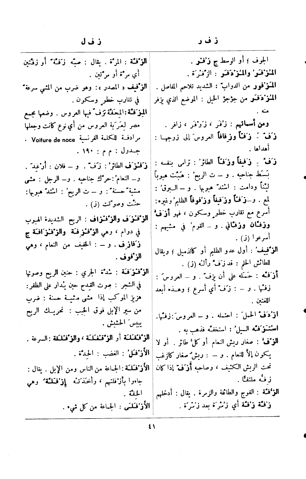 زف- زفيفًا وزفًا الطائر: ترامي بنفسه: بسيط جناحيه. و- ت الريح: هبت هبوبًا لينًا ودامت: اشتد هبوبها. و- البرق: لمع. و- زفًا وزفيفًا وزفوفًا الظليم وغيرة: أسرع مع تقارب خطٍر وسكون، فهو أزف وزفان وزفانييي. و- القوم في مشيهم: أسرعوا (ز).