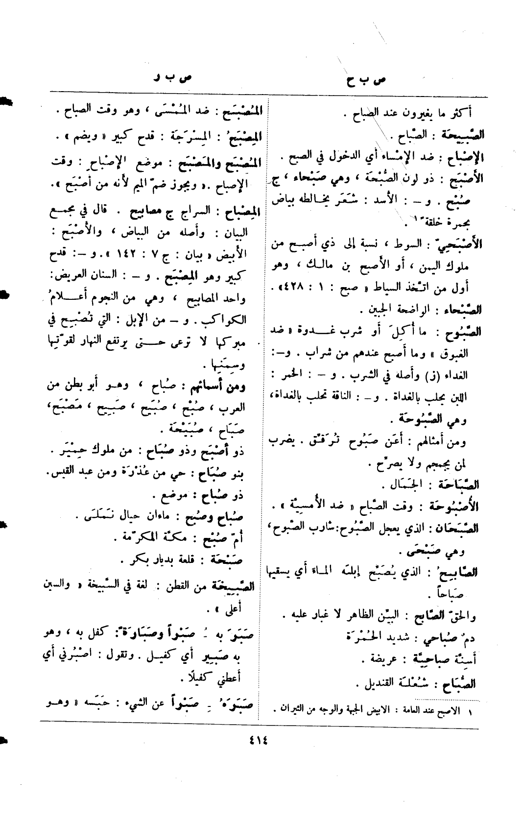 المصباح: السراج ج مصابيح. قال في مجمع البيان: وأصله من البياض، والأصبح: الأبيض "بيان: ج 7: 142". و-: قدح كبير وهو المصبح. و-: السنان العريض: واحد المصابيح، وهي من النجوم أعلام الكواكب. و- من الإبل: التي تُصبح في مبركها ولا ترعى حتى يرتفع النهار لقوتها وسمنها.