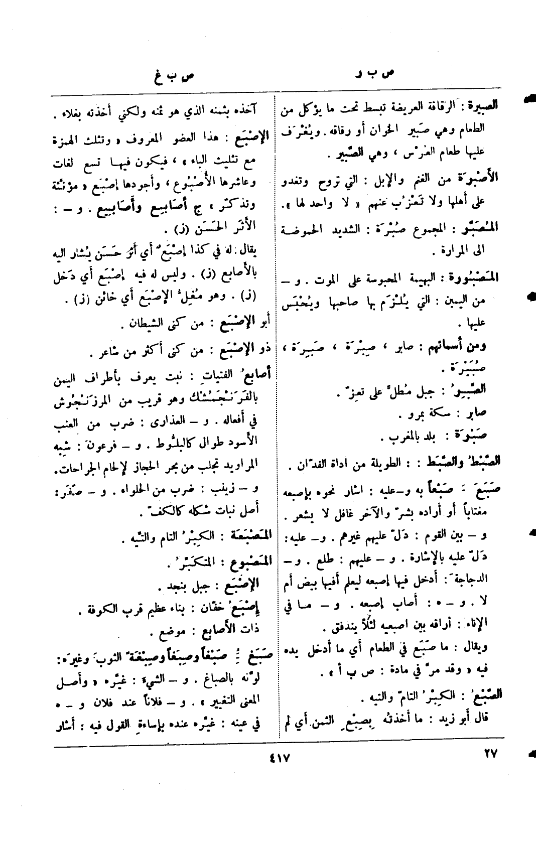 صَبَع- صَبْعًا به و- عليه: أشار نحوه بإصبعه مغتابًا أو أراده بشر والآخر غافل لا يشعر. و- بين القوم: دل عليهم غيرهم. و- عليه: دل عليه بالإشارة. و- عليهم: طلع. و- الدجاجة: أدخل فيها إصبعه ليعلم أفيها بيض أم لا. و- هـ: أصاب إصبعه. و- ما في الإناء: أراقه بين اصبعيه لئلا يندفق.