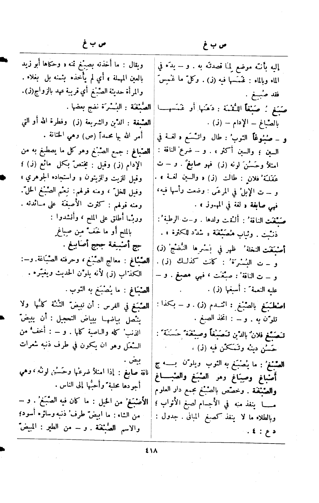 و- صبوغًا الثوب: طال واتسع "لغة في السين؛ والسين أكثر". و- ضرع الناقة: امتلأ وحسن لونه (ز) فهو صابغ. و- ت عفلة فلان: طالت (ز) "والسين لغة". و- ت الإبل في المرعى: وضعت رأسها فيه، فهي صابغة "لغة في المهموز".