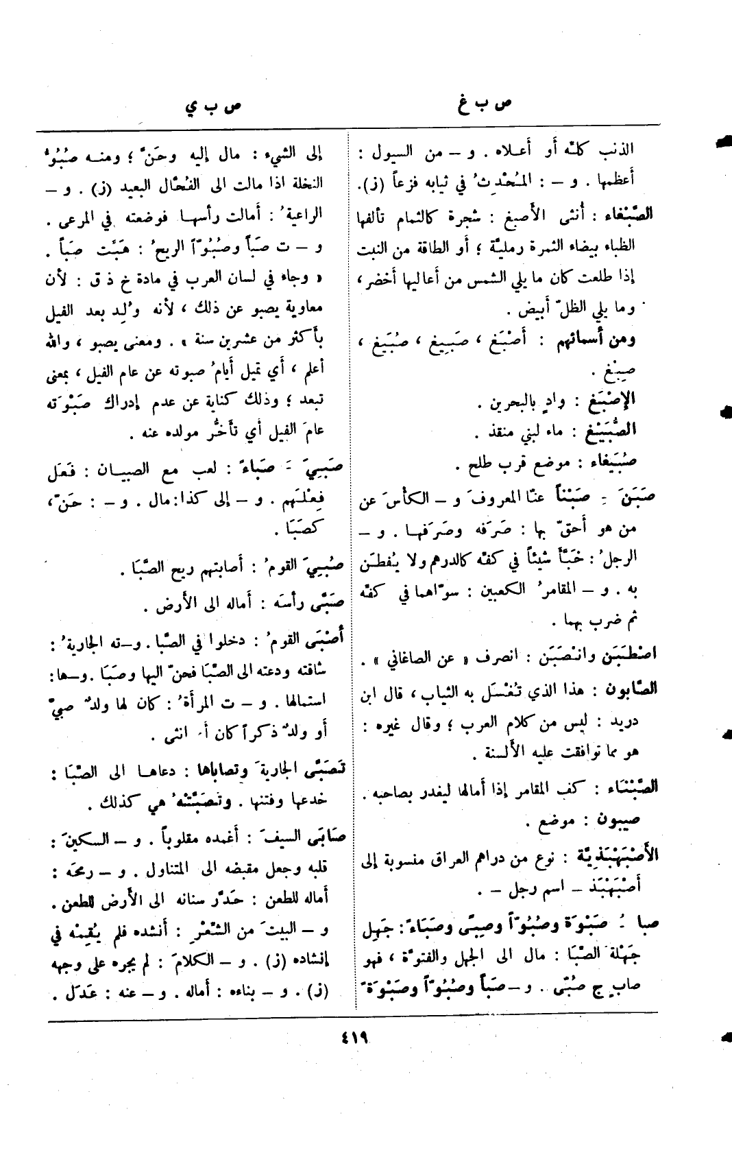 إلى الشيء: مال إليه وحن؛ ومنه صُبُو النخلة إذا مالت إلى الفُحال البعيد (ز). و- الراعية: أمالت رأسها فوضعته في المرعى. و- ت صبًا وصُبُوًا الريح: هبت صبًا. "وجاء في لسان العرب في مادة خ ذ ق: لأن معاوية يصبو عن ذلك، لأنه وُلِد بعد الفيل بأكثر من عشرين سنة". ومعنى يصبو، والله أعلم، أي تميل أيام صبوته عن عام الفيل، بمعنى تبعد؛ وذلك كناية عن عدم إدراك صبوته عام الفيل أي تأخر مولده عنه.