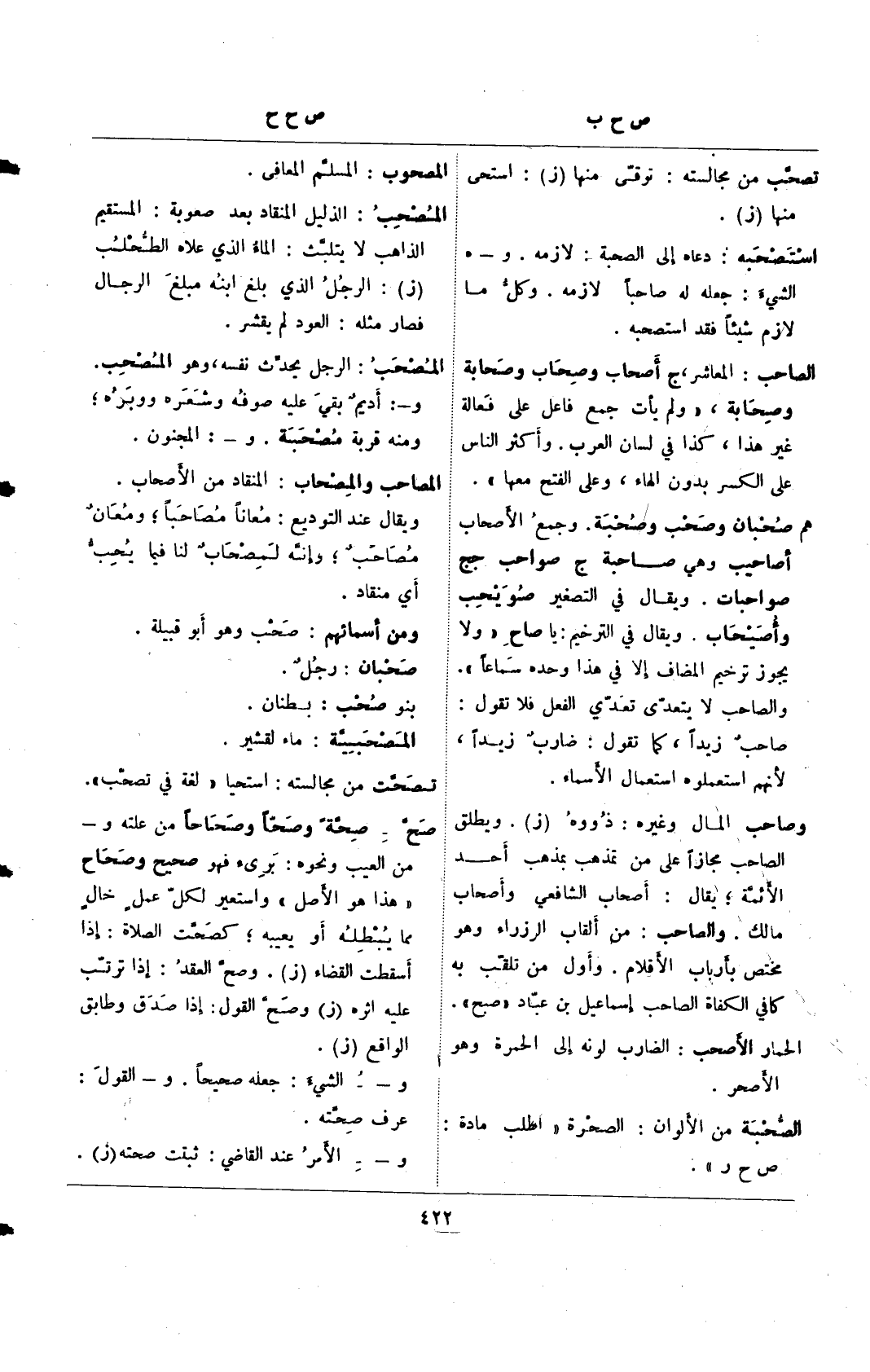 وصاحب المال وغيره: ذووه (ز). ويطلق الصاحب مجازًا على من تمذهب بمذهب أحد الأئمة؛ يقال: أصحاب الشافعي وأصحاب مالك. والصاحب: من ألقاب الرزراء وهو مختص بأرباب الأقلام. وأول من تلقب به كافي الكفاة الصاحب إسماعيل بن عباد "صبح".