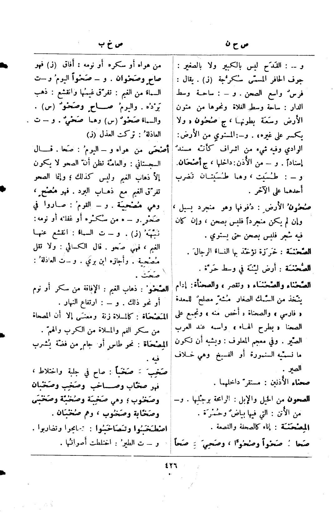 و-: القدح ليس بالكبير ولا بالصغير: جوف الحافر المسمى سكرّجة (ز). يقال: فرسٌ واسع الصحن. و-: ساحة وسط الدار: ساحة وسط الفلاة ونحوها من متون الأرض وسعة بطونها، ج صحون "ولا يكسر على غيره". و-: المستوي من الأرض: الوادي وفيه شيء من إشراف كأنه مسندٌ إسنادًا. و- من الأذن: داخلها، ج أصحان. و-: طُسيت، وهما طُسيتان تضرب أحدهما على الآخر.
