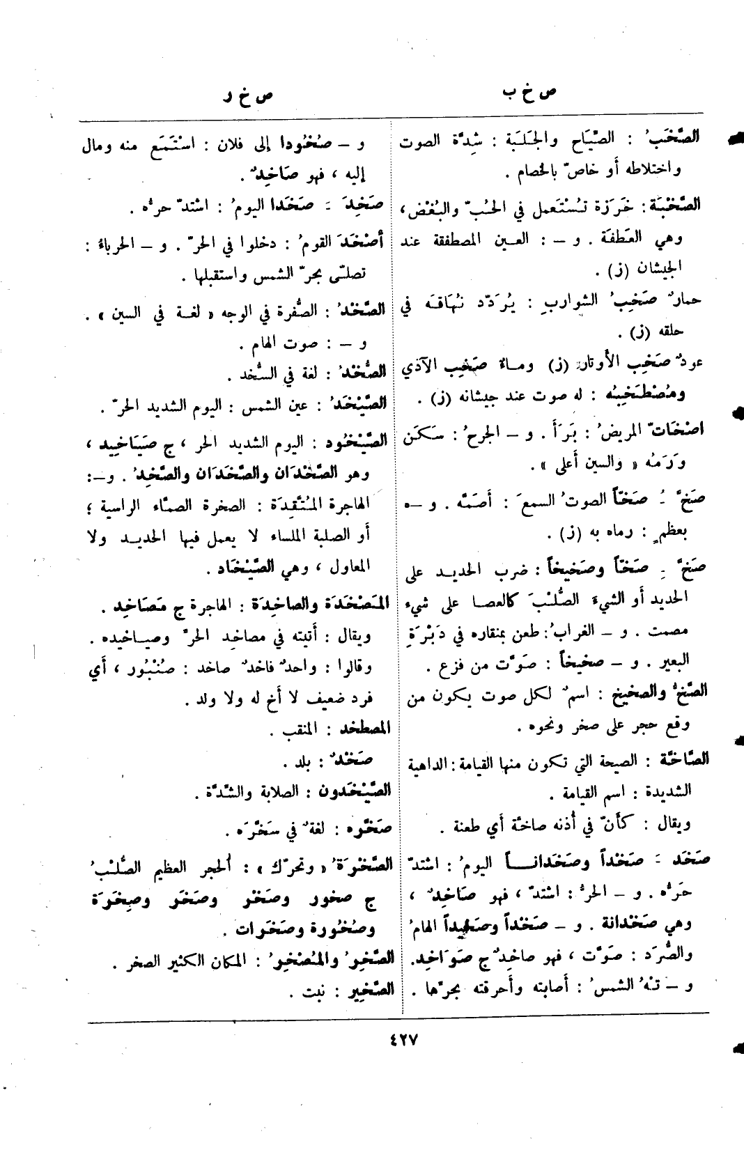 صخد- صخدًا وصخدانًا اليوم: اشتد حره. و- الحر: اشتد، فهو صاخدٌ، وهي صخدانة. و- صخدًا وصخيدًا الهام والصرد: صوت، فهو صاخد ج صواخد. و- ته الشمس: أصابته وأحرقته بحرها.