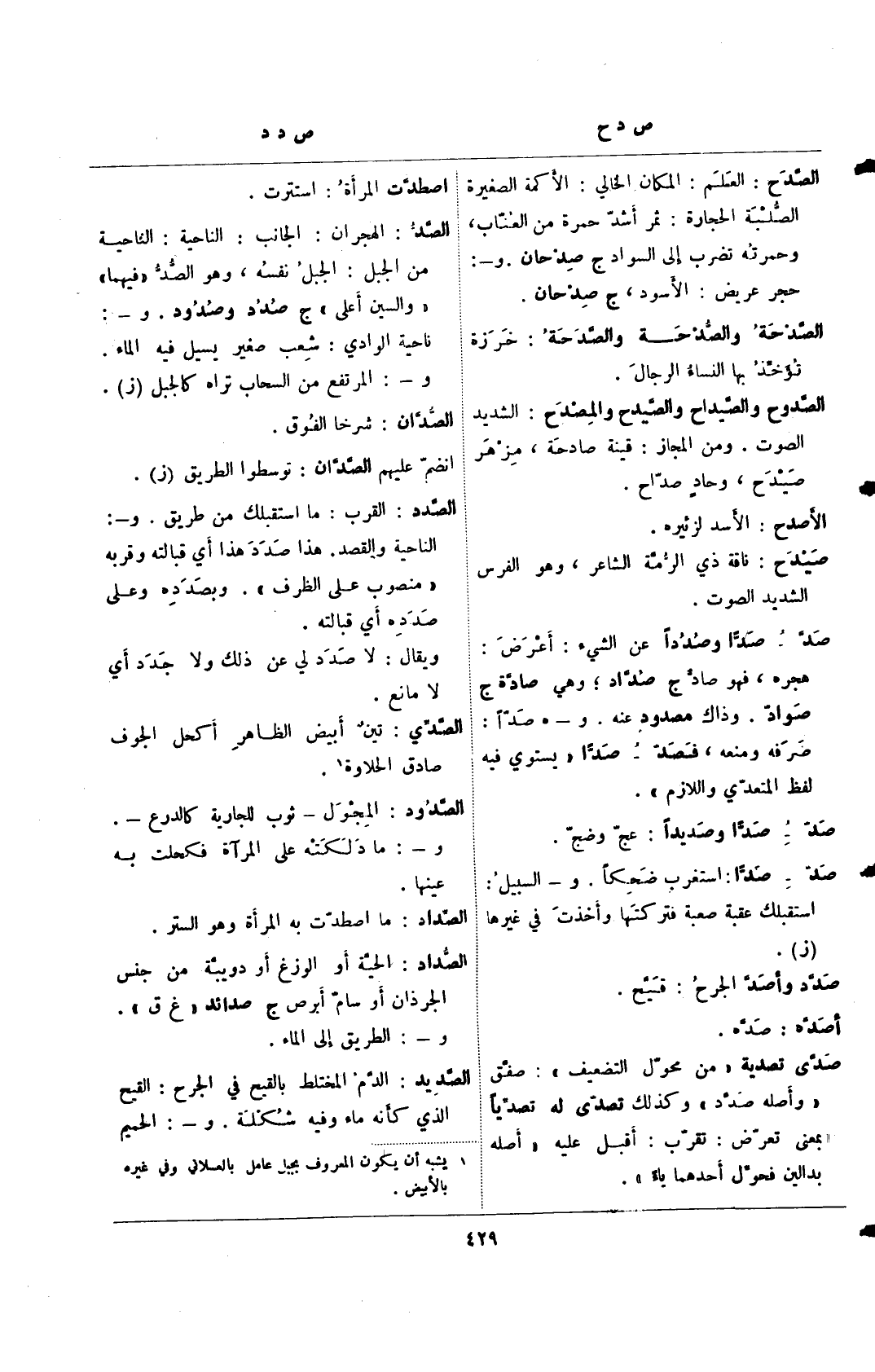 صدّ- صدًا وصُدُدًا عن الشيء: أعرض: هجره، فهو صادٌ ج صُدّاد؛ وهي صادّة ج صواد. وذاك مصدود عنه. و- هـ صدًا: ضرفه ومنعه، فصد- صدًا "يستوي فيه لفظ المتعدي واللازم".