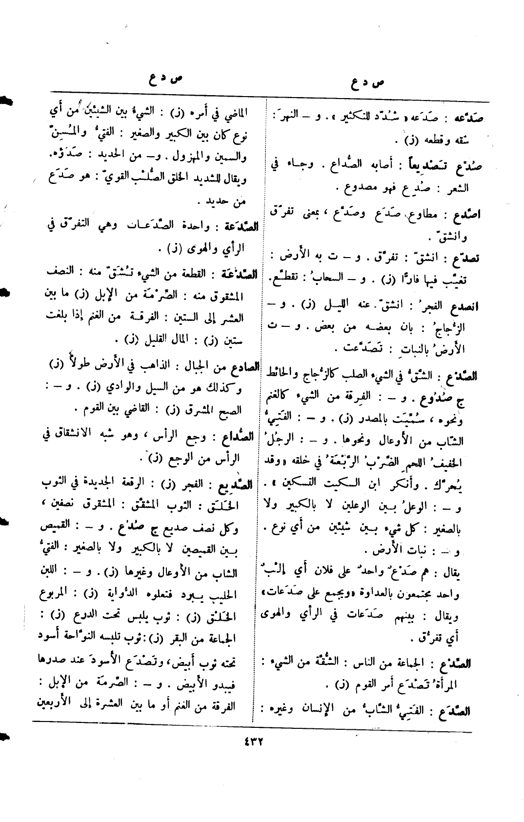 الصديع: الفجر (ز): الرقعة الجديدة في الثوب الخلق: الثوب المشقق: المشقوق نصفين، وكل نصف صديع ج صُدع. و-: القميص بين القميصين لا بالكبير ولا بالصغير: الفتي الشاب من الأوعال وغيرها (ز). و-: اللبن الحليب يبرد فتعلوه الدواية (ز): المربوع الخلق (ز): ثوب يلبس تحت الدرع (ز): الجماعة من البقر (ز): ثوب تلبسه النواحة أسود تحته ثوب أبيض، وتصدع الأسود عند صدرها فيبدو الأبيض. و-: الصرمة من الإبل: الفرقة من الغنم أو ما بين العشرة إلى الأربعين