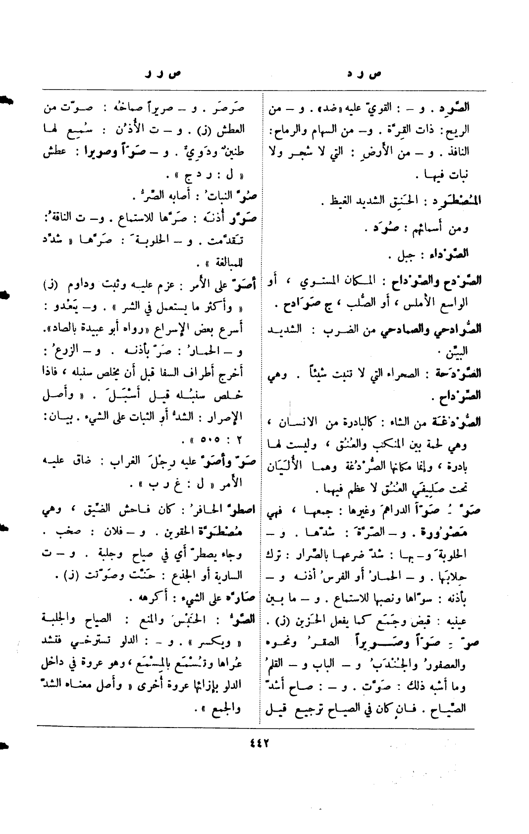 صر- صرًا الدراهم وغيرها: جمعها، فهي مصرورة. و- الصرة: شدها. و- الحلوبة و- بها: شد ضرعها بالصرار: ترك حِلابها. و- الحمار أو الفرس أذنه و- بأذنه: سواها ونصبها للاستماع. و- ما بين عينيه: قبض وجمع كما يفعل الحزين (ز).