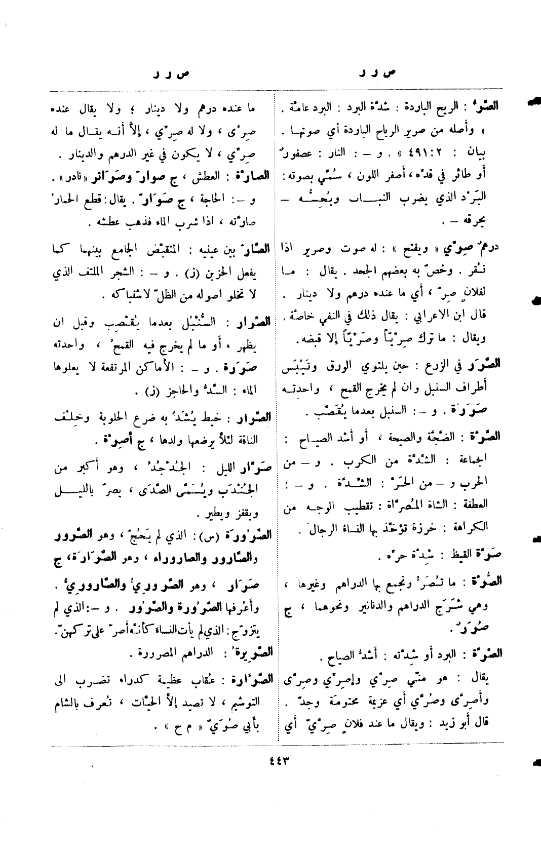 الصر: الريح الباردة: شدة البرد: البرد عامة. "وأصله من صرير الرياح الباردة أي صوتها. بيان: 2: 491". و-: النار: عصفورٌ أو طائر في قده، أصفر اللون، سُمّي بصوته: البرد الذي يضرب النبات ويحسه- يحرقه-.