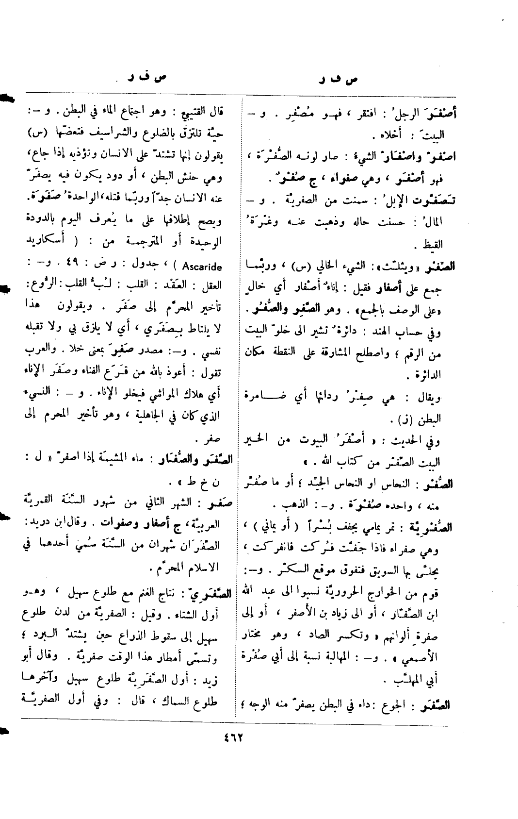 قال القتيبي: وهو اجتماع الماء في البطن. و-: حية تلتزق بالضلوع والشراسيف فتعضها (س) يقولون إنها تشتد على الإنسان وتؤذيه إذا جاع، وهي حنش البطن، أو دود يكون فيه يصفر عنه الإنسان جدًا وربما قتله، الواحدة صفرة. ويصح إطلاقها على ما يعرف اليوم بالدودة الوحيدة أو المترجمة من: (أسكاريد Ascaride)، جدول: ر ض: 49. و-: العقل: العقد: القلب: لب القلب: الروع: تأخير المحرم إلى صفر. ويقولون هذا لا يلتاط بصفري، أي لا يلزق بي ولا تقبله نفسي. و-: مصدر صفر بمعنى خلا. والعرب تقول: أعوذ بالله من قرع الفناء وصفر الإناء أي هلاك المواشي فيخلو الإناء. و-: النسيء الذي كان في الجاهلية، وهو تأخير المحرم إلى صفر.