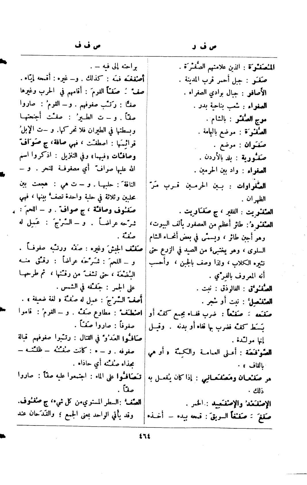 قوائمها: اصطفت، فهي صافة، ج صواف وصافات "فيهما" وفي التنزيل: اذكروا اسم الله عليها صواف أي مصفوفة للنحر. و – الناقة: حلبها. و – ت هي: هجعت بين محلبين وثلاثة في حلبة واحدة نصف بينها، فهي صفوف وصافة، ج صواف. و – اللحم: شرحه عراضًا. و – السرج: عمل له صفة.