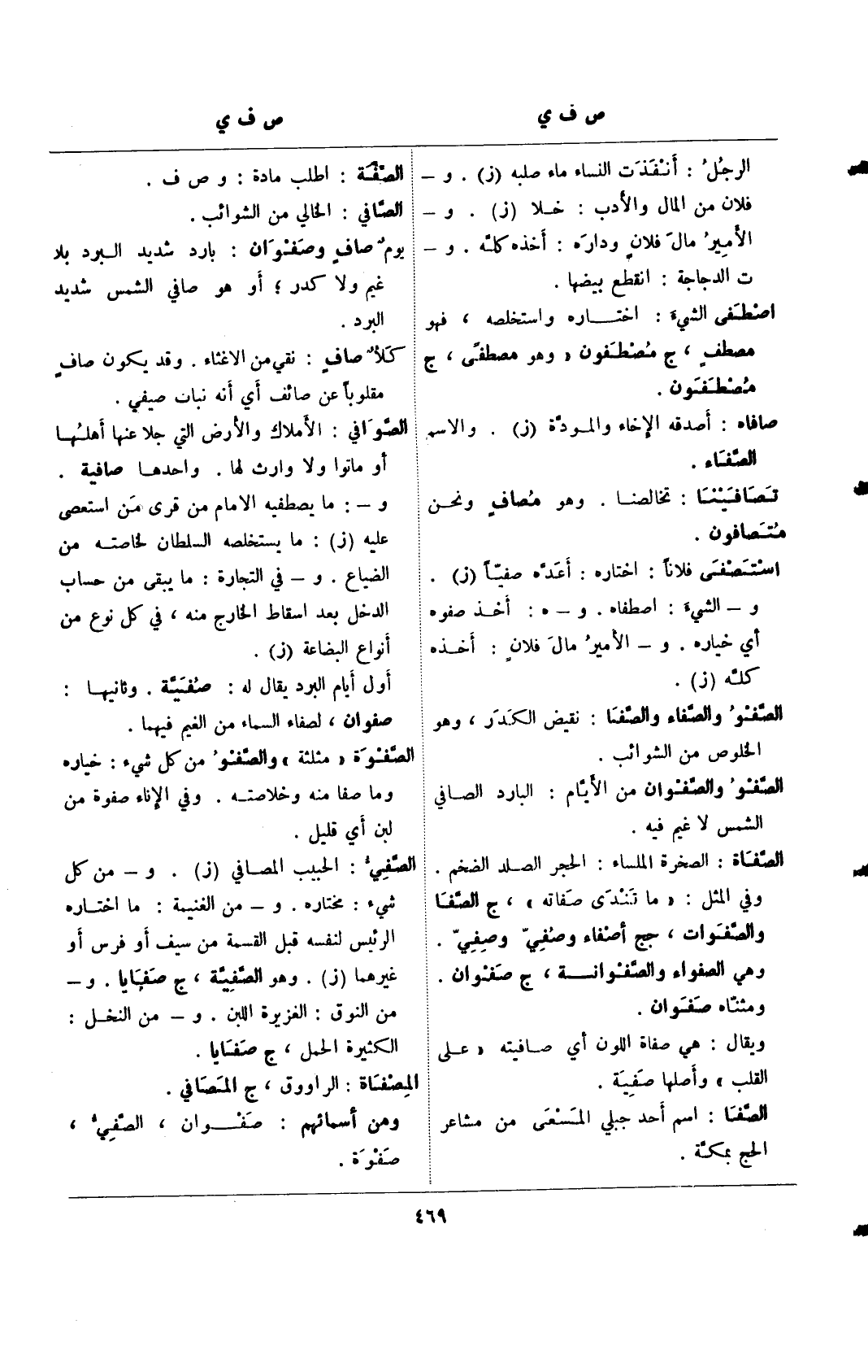 الصفي: الحبيب المصافي (ز). و- من كل شيء: مختاره. و- من الغنيمة: ما اختاره الرئيس لنفسه قبل القسمة من سيف أو فرس أو غيرهما (ز). وهو الصفية، ج صفايا. و- من النوق: الغزيرة اللبن. و- من النخل: الكثيرة الحمل، ج صفايا.