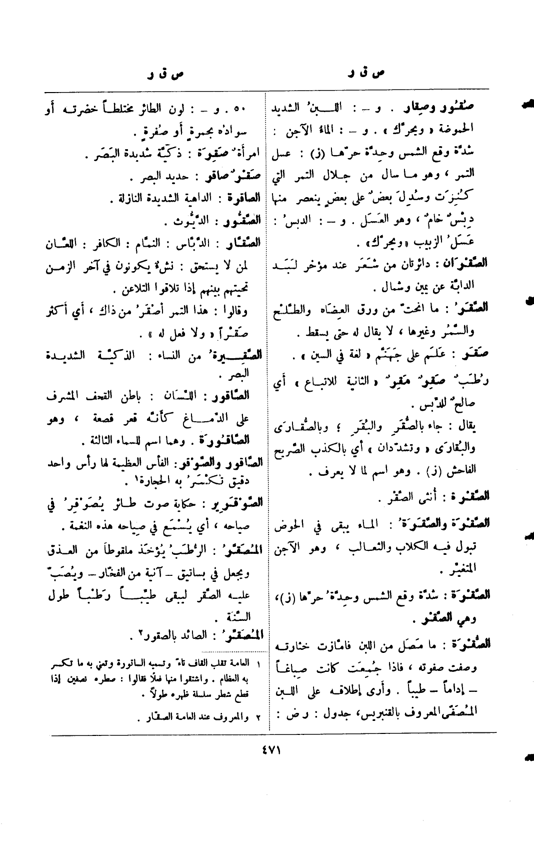 صقور وصقار. و-: اللبن الشديد الحموضة "ويحرك". و-: الماء الآجن: شدة وقع الشمس وحدة حرها (ز): عسل التمر، وهو ما سال من جلال التمر التي كنزت وسدل بعض على بعض ينعصر منها دبس خام، وهو العسل. و-: الدبس: عسل الزبيب "ويحرك".+