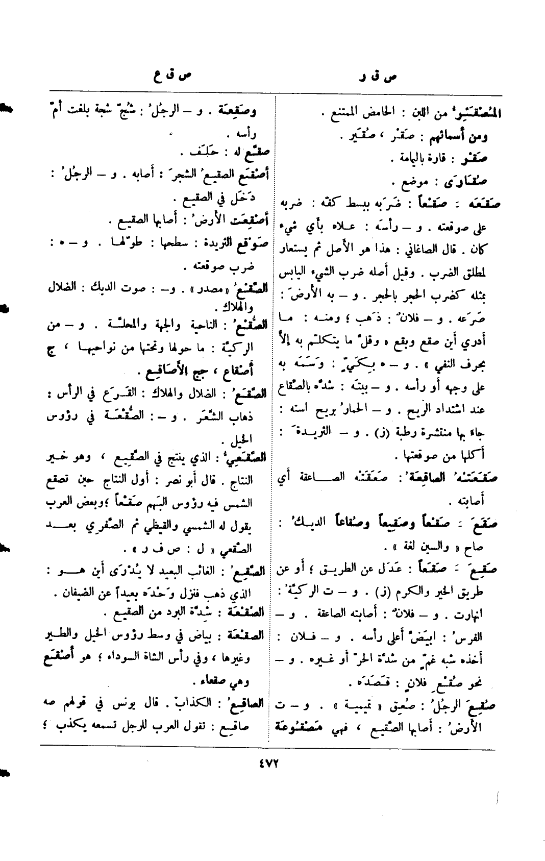 صقع- صقعًا: عدل عن الطريق؛ أو عن طريق الخير والكرم (ز). و- ت الركية: انهارت. و- فلان: أصابته الصاعقة. و- الفرس: أبيض أعلى رأسه. و- فلان: أخذه شبه غم من شدة الحر أو غيره. و- نحو صقع فلان: قصده.