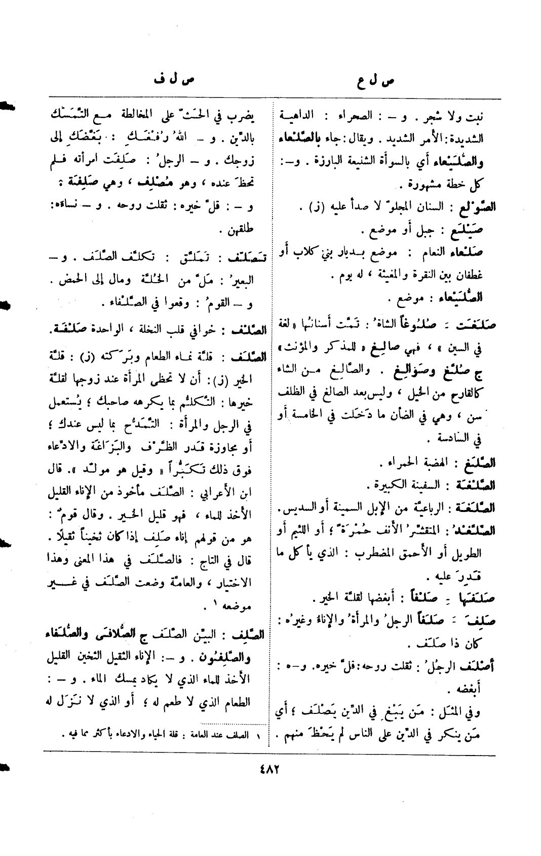 الصلف: البين الصلف ج الصلافي والصلفاء والصلفون. و-: الإناء الثقيل الثخين القليل الأخذ للماء الذي لا يكاد يمسك الماء. و-: الطعام الذي لا طعم له؛ أو الذي لا نزل له
