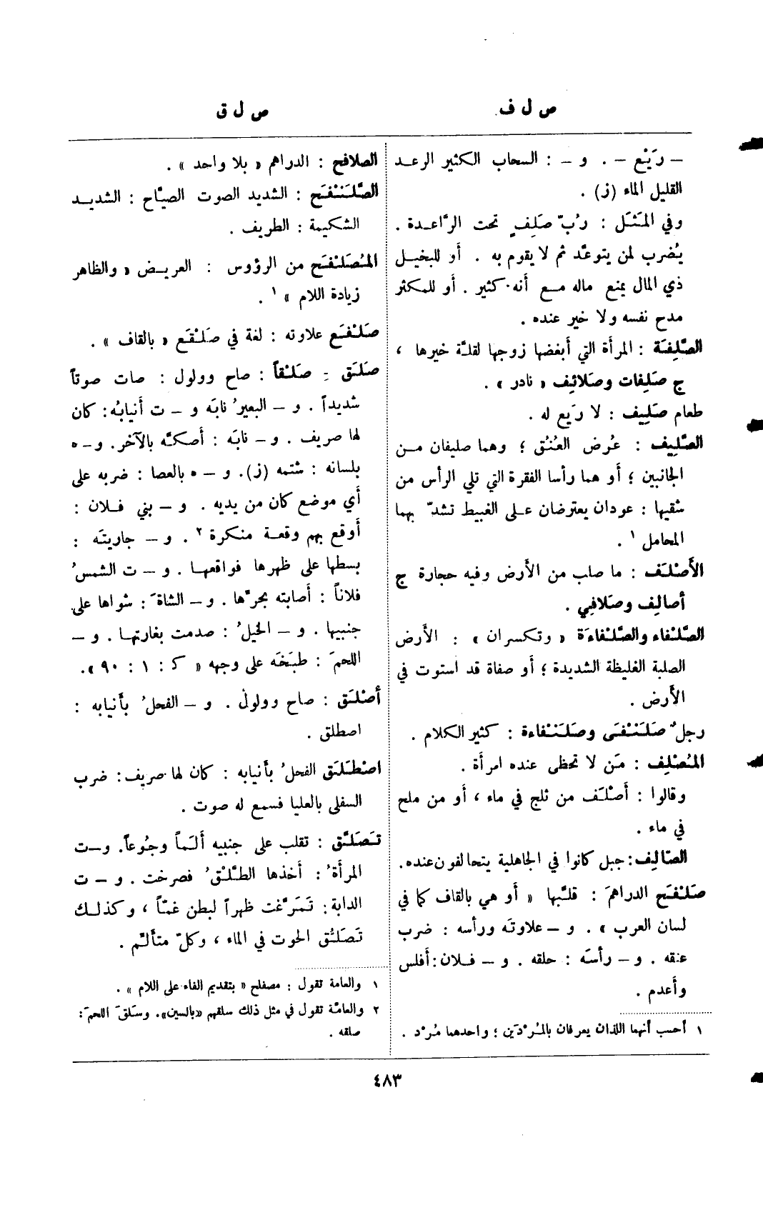 صلق – صلقًا: صاح وولول: صات صوتًا شديدًا. و- البعير نابه و- ت أنيابه: كان لها صريف. و- نابه: أصكه بالآخر. و-هـ بلسانه: شتمه (ز). و-هـ بالعصا: ضربه على أي موضع كان من يديه. و- بني فلان: أوقع بهم وقعة منكرة (¬3). و- جاريته: بسطها على ظهرها فواقعها. و- ت الشمس فلانًا: أصابته بحرها. و- الشاة: شواها على جنبيها. و- الخيل: صدمت بغارتها. و- اللحم: طبخه على وجهه "كـ: 1: 90".