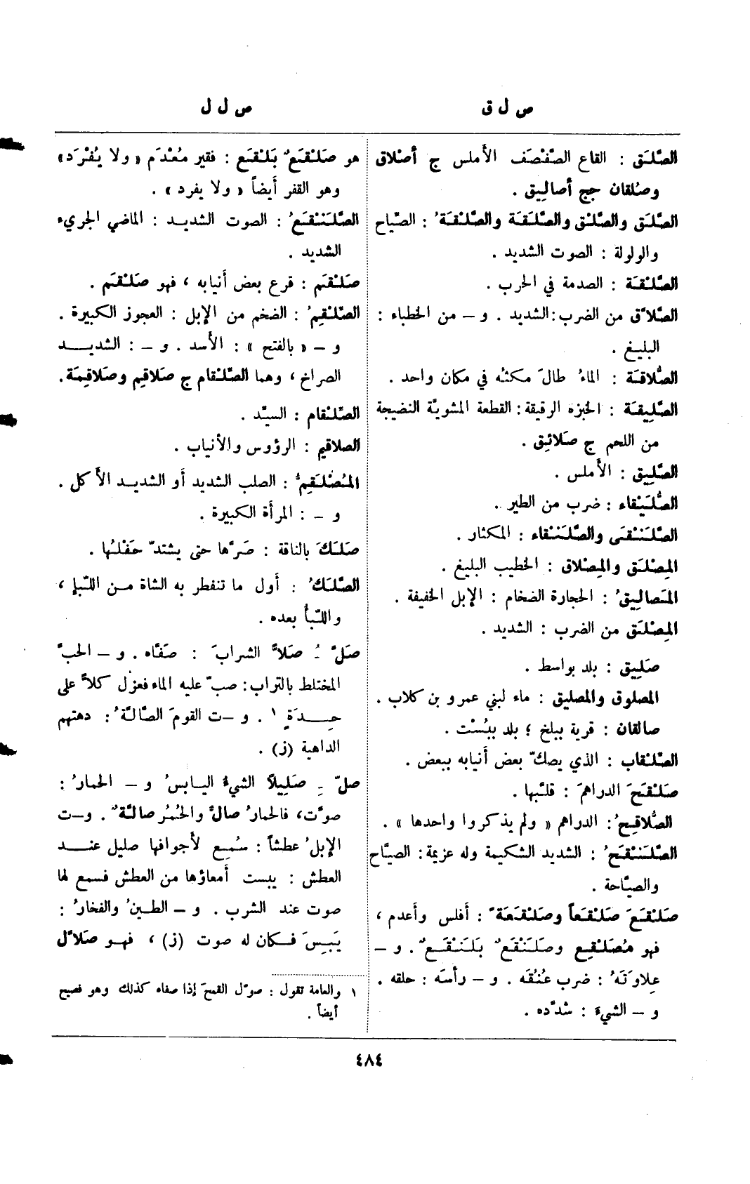 صل – صليلًا الشيء اليابس و- الحمار: صوت، فالحمار صال والحمر صالة. و- ت الإبل عطشًا: سمع لأجوافها صليل عند العطش: يبست أمعاؤها من العطش فسمع لها صوت عند الشرب. و- الطين والفخار: يبس فكان له صوت (ز)، فهو صلال