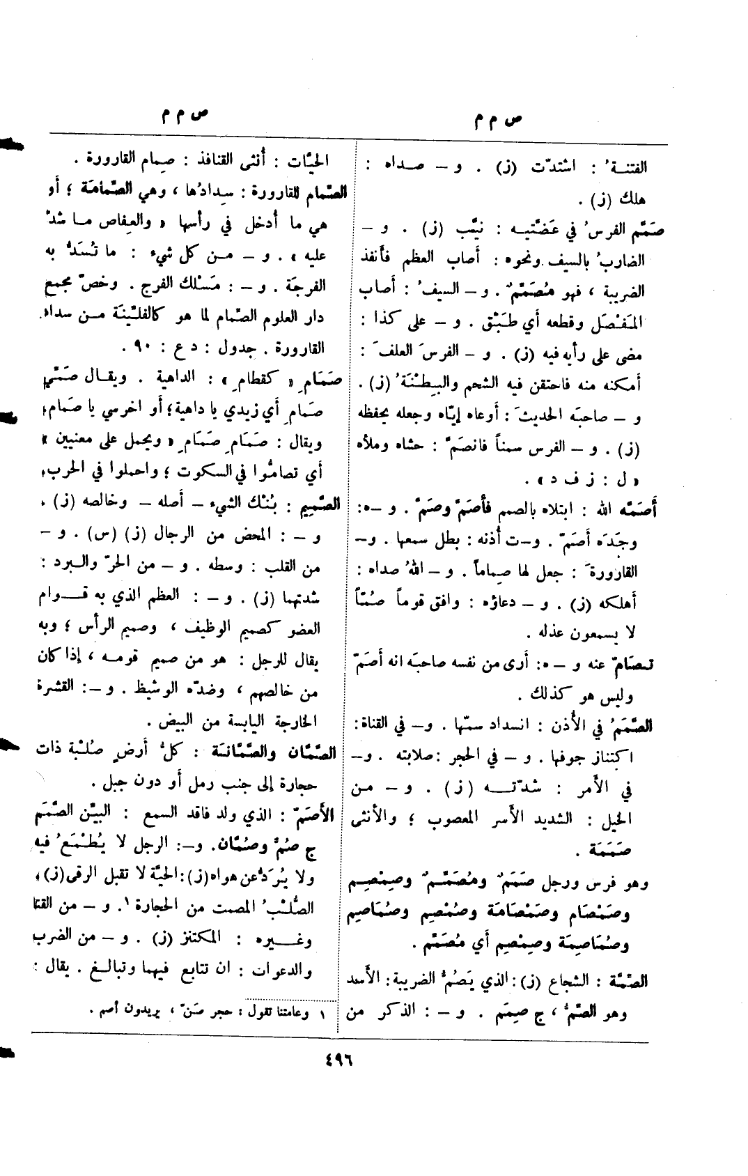 الأصم: الذي ولد فاقد السمع: البين الصمم ج صم وصمان. و-: الرجل لا يطمع فيه ولا يرد عن هواه (ز): الحية لا تقبل الرقي (ز).