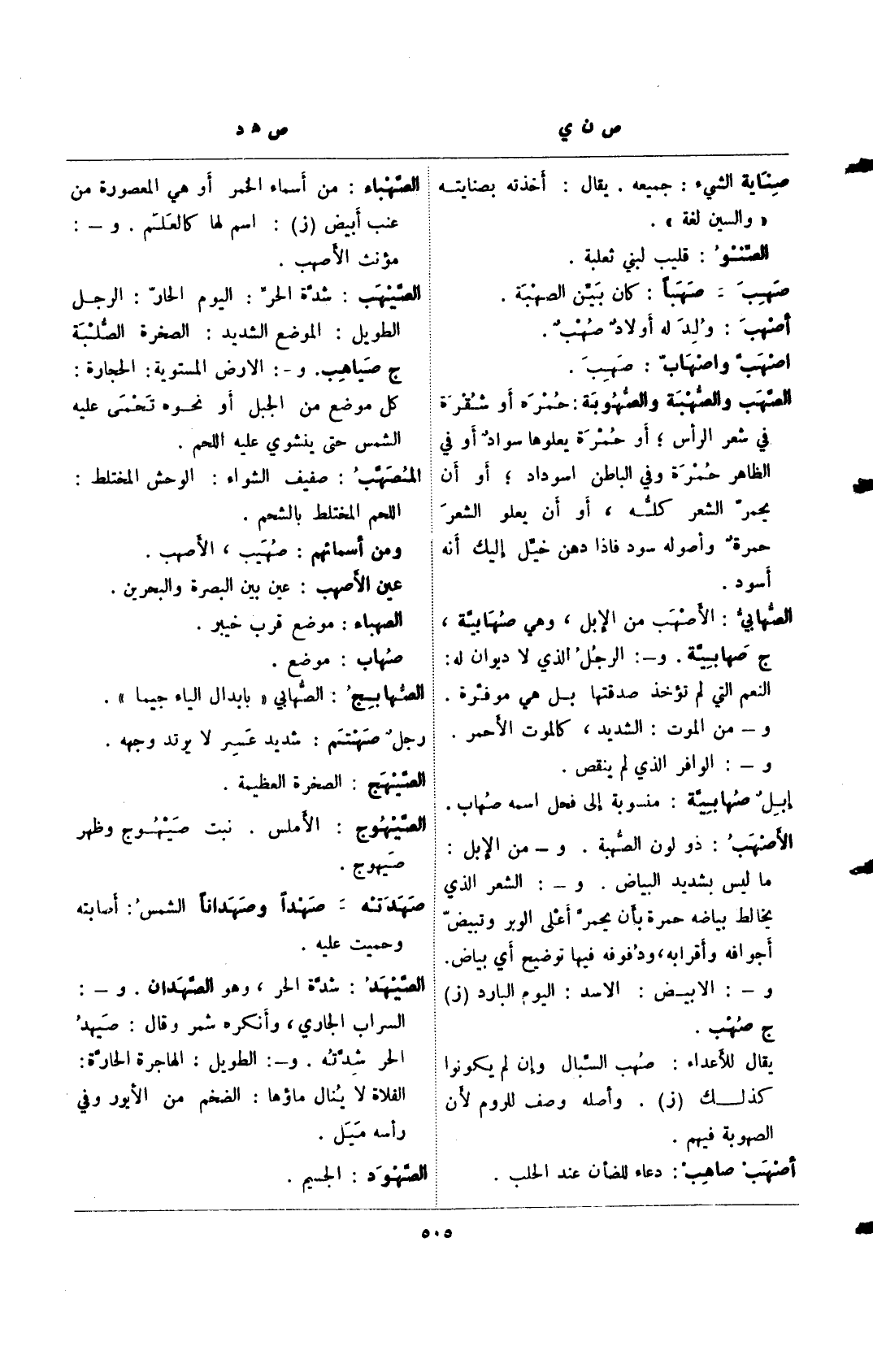 الصهابي: الأصهب من الإبل، وهي صهابية، ج صهابية. و-: الرجل الذي لا ديوان له: النعم التي لم تؤخذ صدقتها بل هي موفرة. و- من الموت: الشديد، كالموت الأحمر. و-: الوافر الذي لم ينقص.