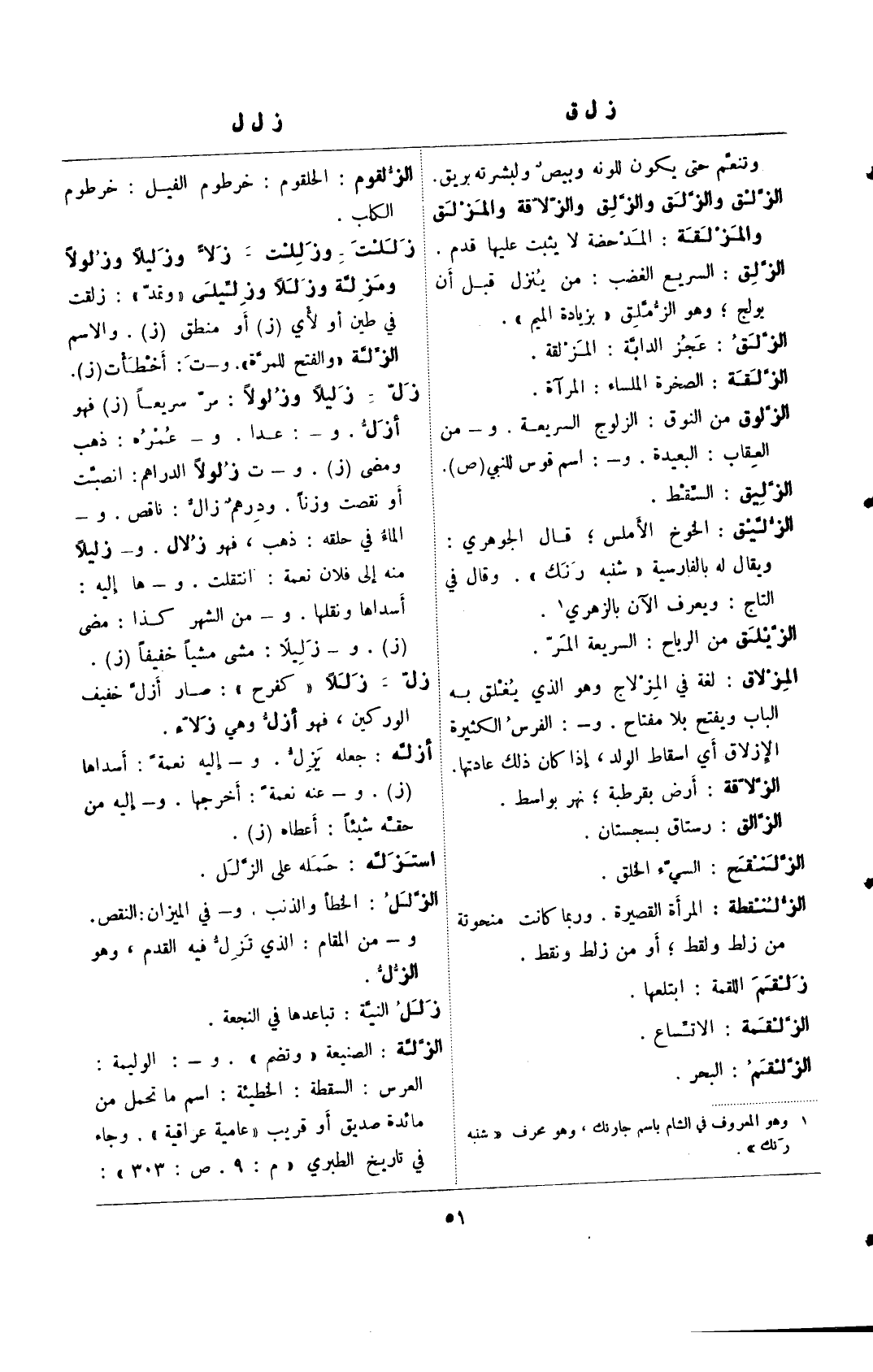 زللت- وزللت- زلا وزليلًا وزلولاً ومزلة وزلًا وزليلى "وتمد": زلقتفي طين او لأي (ز) أو منطق (ز). والاسم الزلة "والفتح للمرة". و- ت: أخطأت (ز). زل- زليًا وزلولًا: سر سريعًا (ز) فهوأزل. و-: عدا. و- عمره: ذهب ومضى (ز). و- ت زلولًا الدراهم: انصبت أو نقصت وزنًا. ودرهم زال: ناقص. و- الماء في حلقه: ذهب، فهو زلال. و- زليلًا منه إلى فلان نعمة: انتقلت. و- ها إليه: أسداها ونقلها. و- من الشهر كذا: مضى (ز). و- زليلًا: مشى مشيًا خفيفًا (ز).