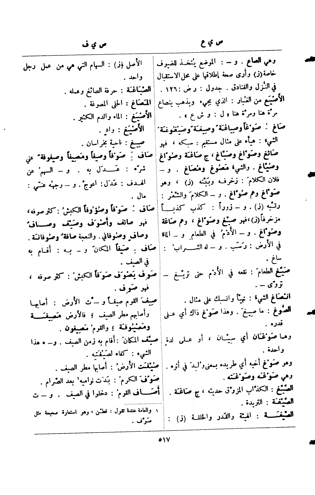صاف- صوفًا وصؤوفًا الكبش: كثر صوفه، فهو صائف وأصوف وصيف وصافٌ وصافٍ وصوفاني. والنعجة صافةٌ وصوفانة.