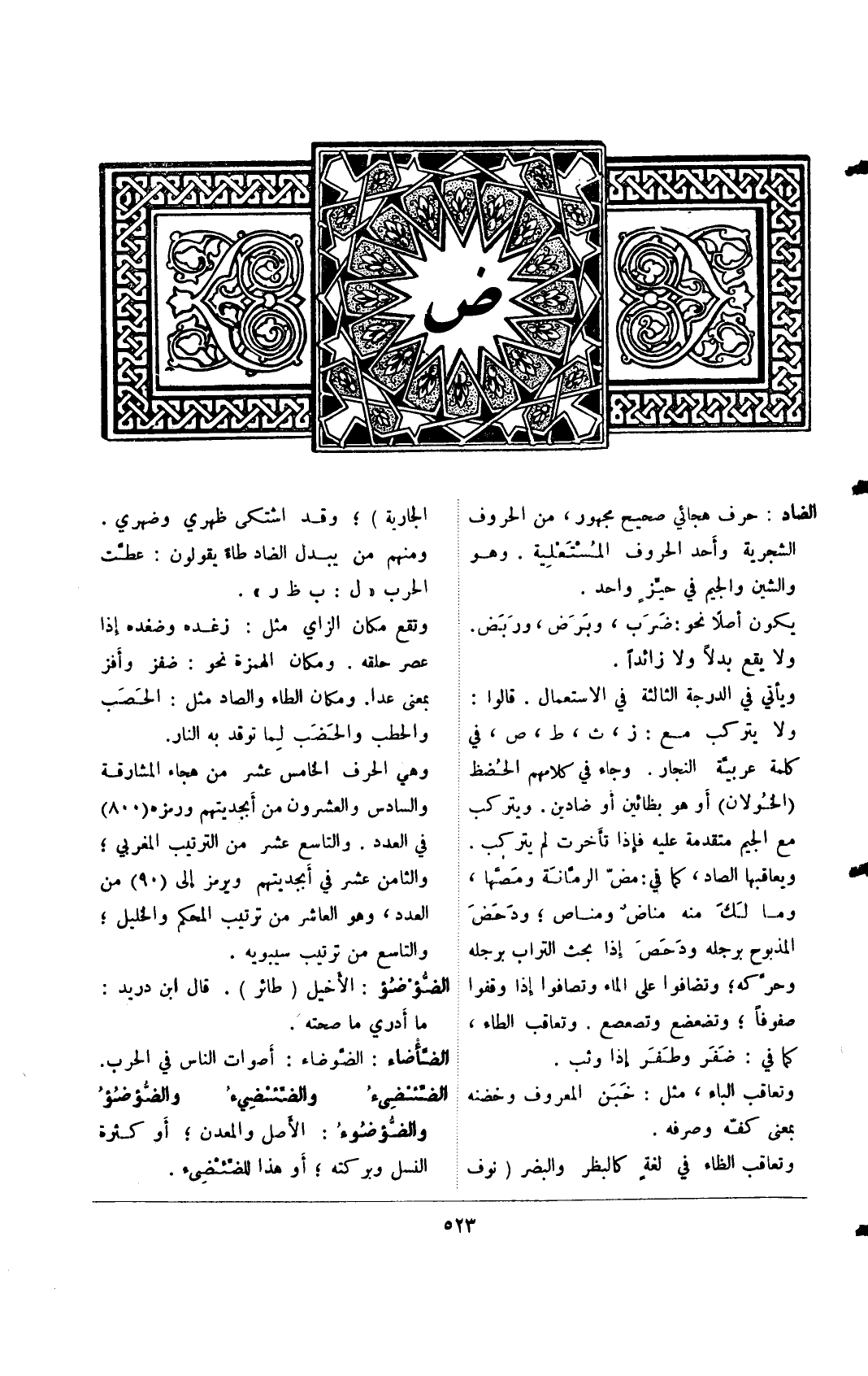 الضاد: حرف هجائي صحيح مجهور، من الحروف الشجرية وأحد الحروف المستعلية. وهو والشين والجيم في حيزٍ واحد.
