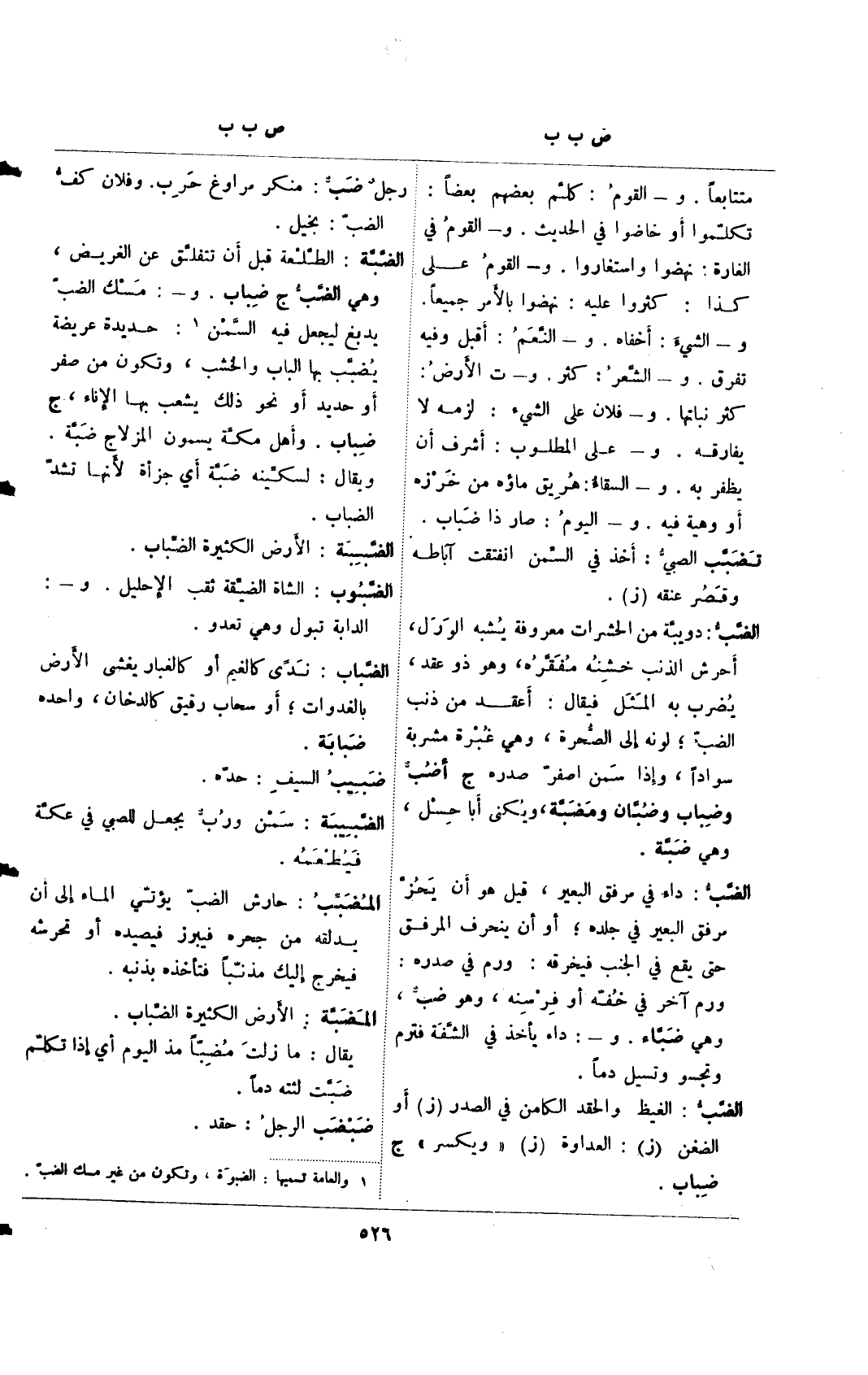 الضب: دويبة من الحشرات معروفة يشبه الورل، أحرش الذنب خشنه مفقره، وهو ذو عقد، يضرب به المثل فيقال: أقعد من ذنب الضب؛ لونه إلى الصحرة، وهي غبرة مشربة سوادًا، وإذا سمن اصفر صدره ج أضب وضباب وضبان ومضبة، ويكنى أبا حسل، وهي ضبة.