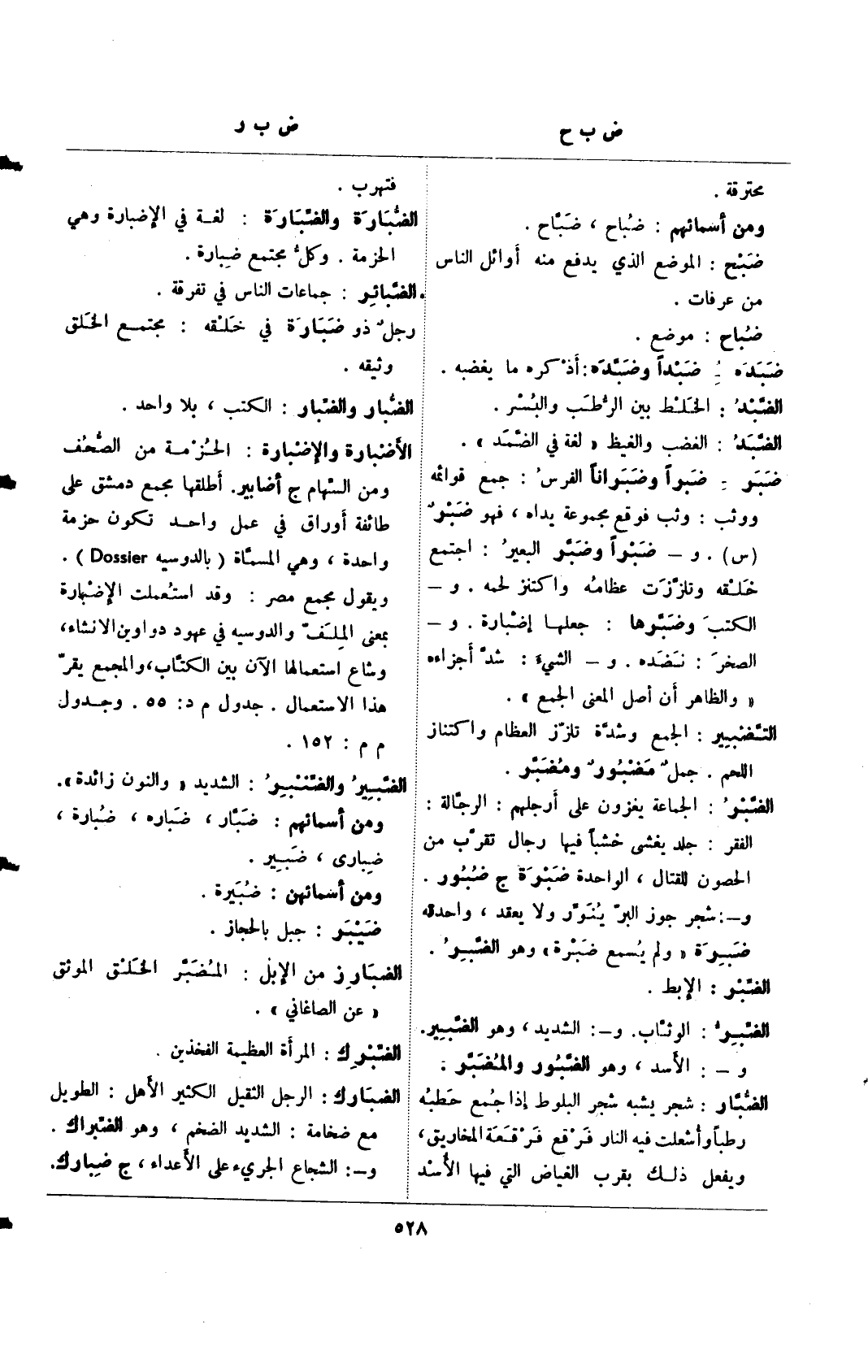 ضبر- ضبرًا وضبرانًا الفرس: جمع قوائمه ووثب: وثب فوقع مجموعة يداه، فهو ضبرٌ (س). و- ضبرًا وضبر البعير: اجتمع خلقه وتلززت عظامه واكتنز لحمه. و- الكتب وضبرها: جعلها إضبارة. و- الصخر: نضده. و- الشيء: شد أجزاءه "والظاهر أن أصل المعنى الجمع".