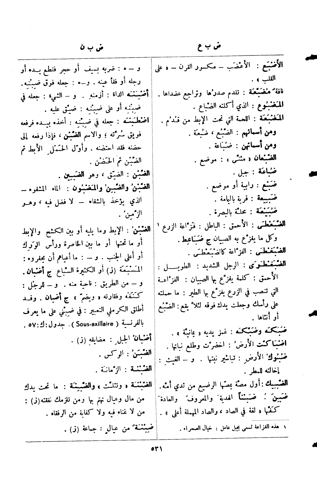 الضبن: الإبط وما يليه أو بين الكشح والإبط أو ما تحتها أو ما بين الخاصرة ورأس الورك أو على الجنب. و-: ما أعياهم أن يحفروه: المسبعة (ز) أو الكثيرة السباع ج أضبان. و- من الطريق: ناحية منه. و- للرجل: كنفه وفقارته "ويضم" ج أضبان. وقد أطلق الكرميلي التعبير: في ضبني على ما يعرف بالفرنسية (Sous- axillaire). جدول: ك: 57.