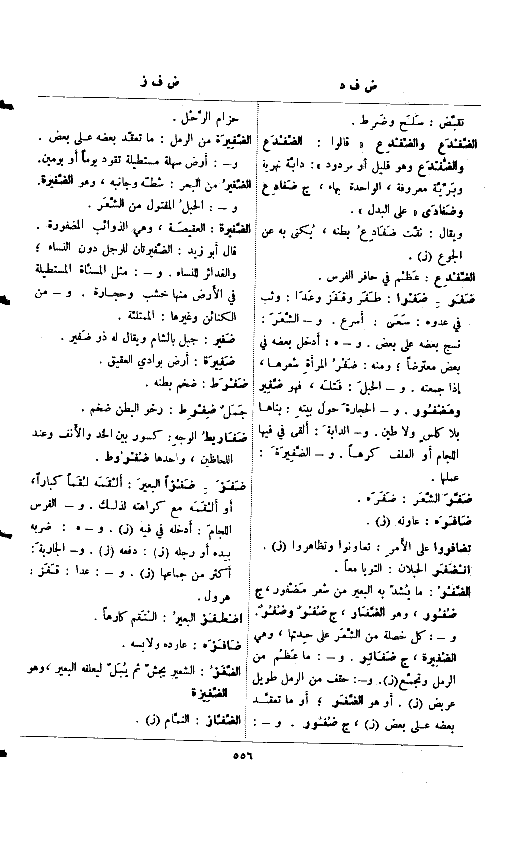 ضفز= ضفزً البعير: ألقمه لقمً كبارً، أو لقمه مع كراهته لذلك. و- الفرس اللجام: أدخله في فيه (ز). و- هـ: ضربه بيده أو رجله (ز): دفعه (ز). و- الجارية: أكثر من جماعها (ز). و-: عدا: قفز: هرول.