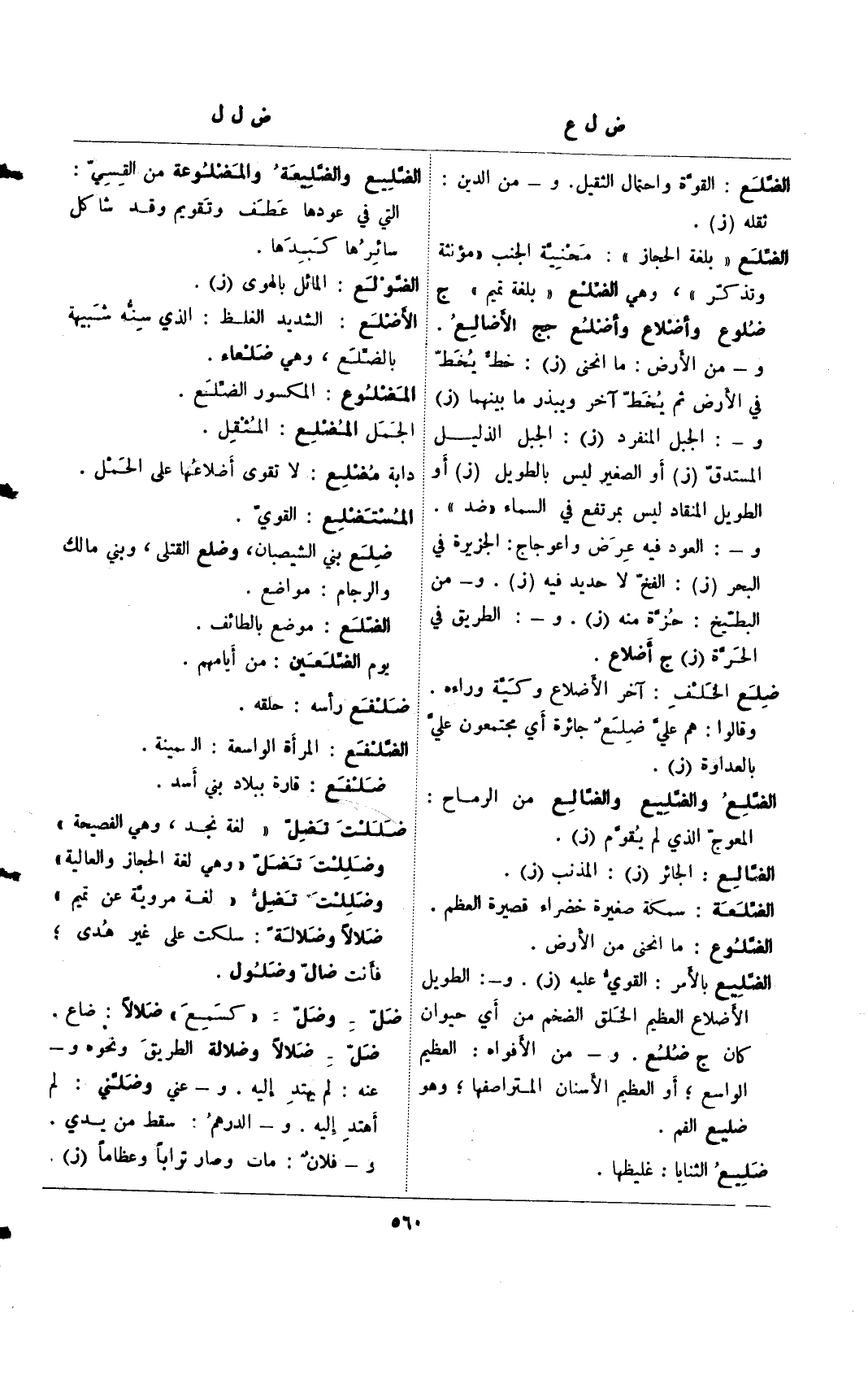 الضلع "بلغة الحجاز": محنية الجنب "مؤنثة وتذكر"، وهي الضلع "بلغة تميم" ج ضلوع وأضلاع وأضلع جج الأضالع. و- من الأرض: ما انحنى (ز): خط يخط في الأرض ثم يخط آخر ويبذر ما بينهما (ز) و-: الجبل المنفرد (ز): الذليل المستدق (ز) أو الصغير ليس بالطويل (ز) أو الطويل المنقاد ليس بمرتفع في السماء "ضد". و-: العود فيه عرض واعوجاج: الجزيرة في البحر (ز): الفخ لا حديد فيه (ز). و- من البطيخ: حزة منه (ز). و-: الطريق في الحرة (ز) ج أضلاع.