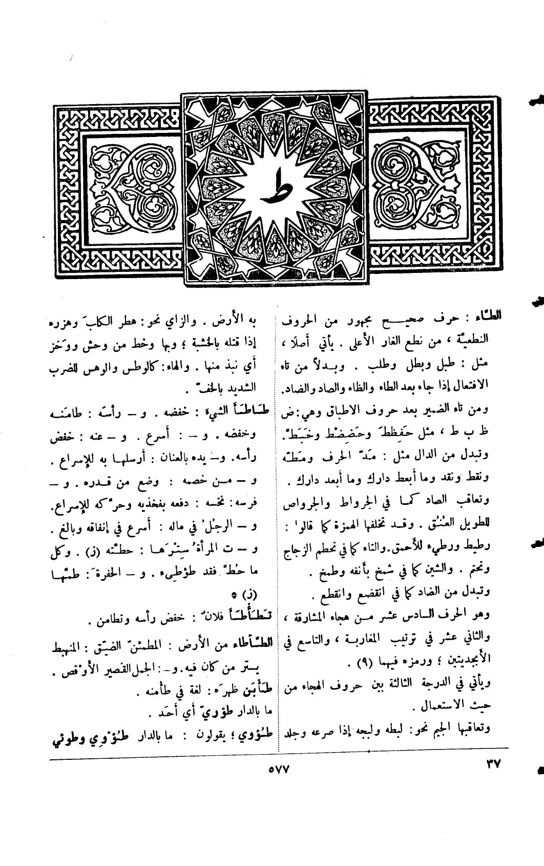 الطاء: حرف صحيح مجهور من الحروف النطعية، من نطع الغار الأعلى. يأتي أصلا، مثل: طبل وبطل وطلب. وبدلً من تاء الافتعال إذا جاء بعد الطاء والظاء والصاد والضاد. ومن تاء الضمير بعد الحروف الاطباق وهي: ض ظ ب ط، مثل حفظط وحضضط وخبط. وتبدل من الدال مثل: مد الحرف ومطه ونقط ونقد وما أبعط دارك. وتعاقب الصاد كما في الجرواط والجرواص الطويل العنق. وقد تخلفها الهمزة كما قالوا: رطيط ورطيء للأحمق. والتاء كما في تحطم الزجاج وتحتم. والشين كما في شمخ بأنفه وطمخ. وتبدل من الضاد كما في انقضع وانقطع. وهو الحرف السادس عشر من هجاء المشارقة، والثاني عشر في ترتيب المغاربة، والتاسع في الأبجديتين؛ ورمزه فيهما (9). ويأتي في الدرجة الثاثلة بين حروف الهجاء من حيث الاستعمال. وتعاقبها الجيم نحو: لبطه ولبجه إذا صرعه وجلد به الأرض. والزاي نحو: هطر الكلب وهزره إذا قتله بالخشبة؛ وبها وخط من وحش ووخز أي نبذ منها. والهاء: كالوطس والوهس للضرب الشديد بالخف.