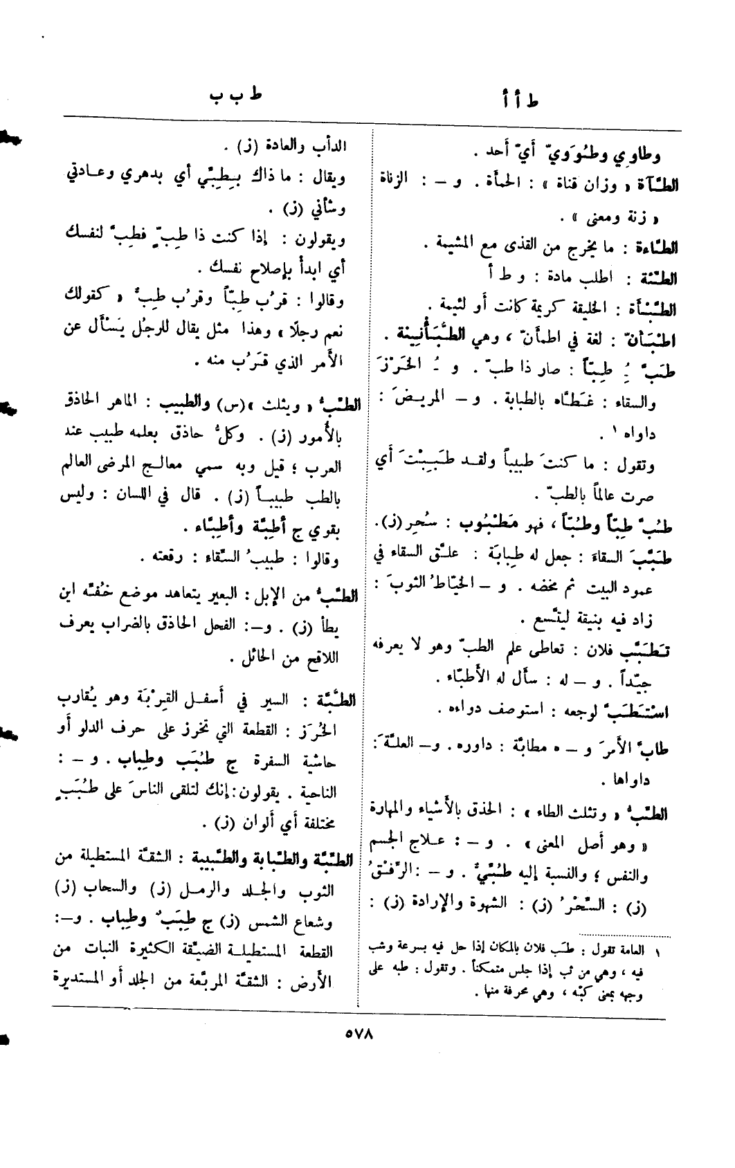 الطب "ويثلث" (س) والطبيب: الماهر الحاذق بالأمور (ز). وكل حاذق بعلمه طبيب عند العرب؛ قيل وبه سمي معالج المرضى العالم بالطب طبيبً (ز). قال في اللسان: وليس بقوي ج أطبة وأطباء. وقالوا: طبيب السقاء: رقعته.