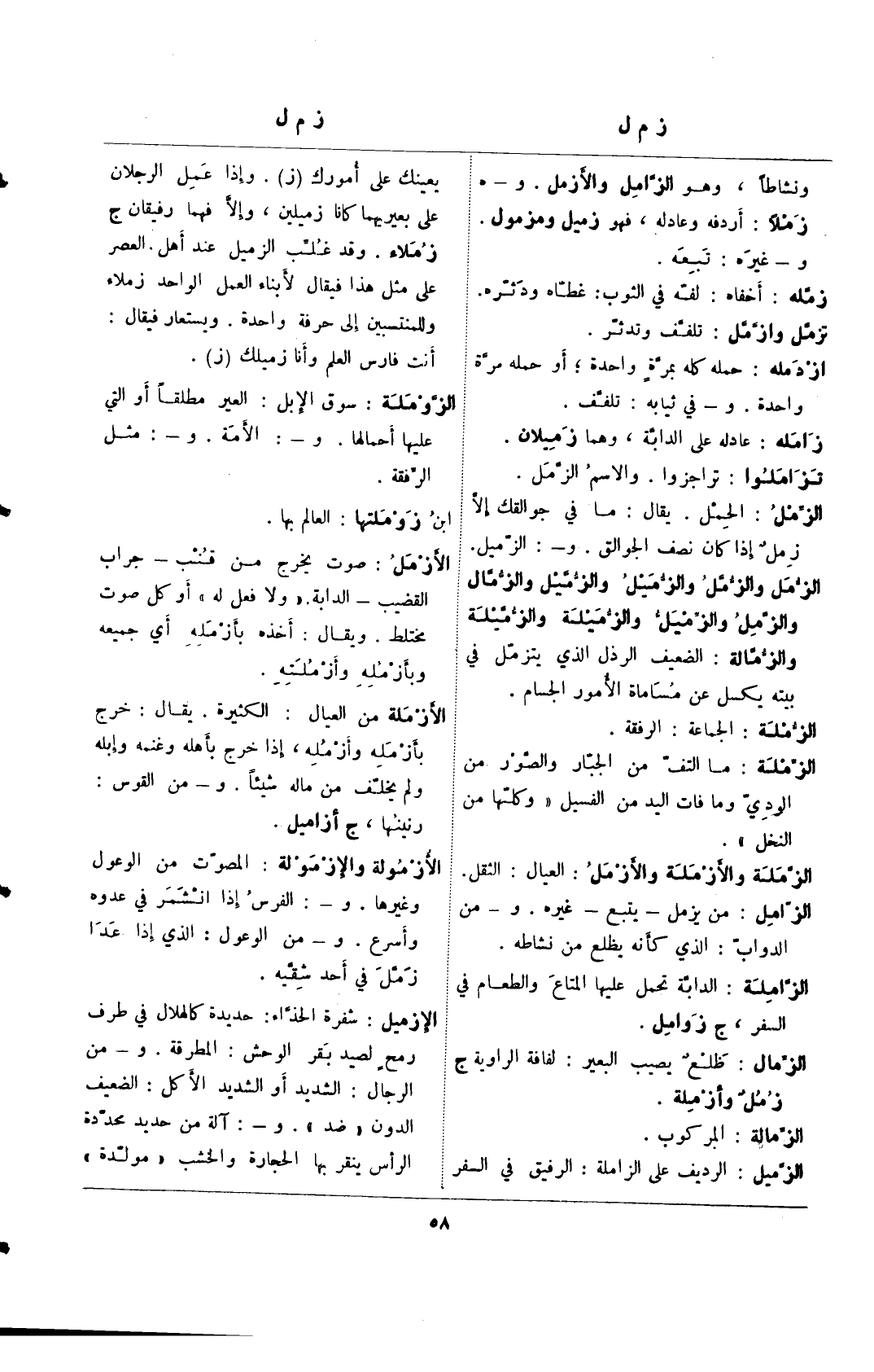 الزمل والزمل والزميل والزميل والزمال والزمل والزميل والزميلة والزميلة والزمالة: الضعيف الرذل الذي يتزمل في بيته يكسل عن مساماة الأمور الجسام.