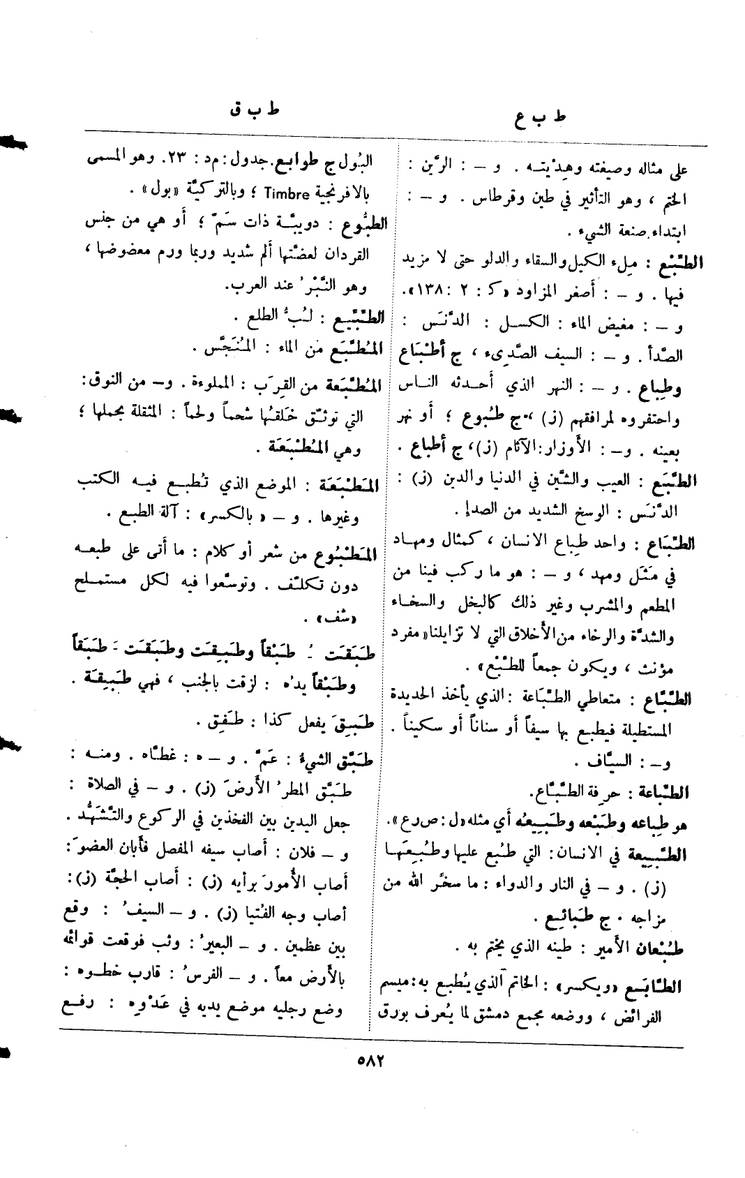 الطبع: ملء الكيل والسقاء والدلو حتى لا مزيد فيها. و-: أصغر المزاود "ک: 2: 138". و-: مغيض الماء: الكسل: الدنس: الصدأ. و-: السيف الصدئ، ج أطباع وطباع. و-: النهر الذي أحدثه الناس واحتفروه لمرافقهم (ز)، . ج طبوع؛ أو نهر بعينه. و-: الأوزار: الآثار (ز)، ج أطباع.