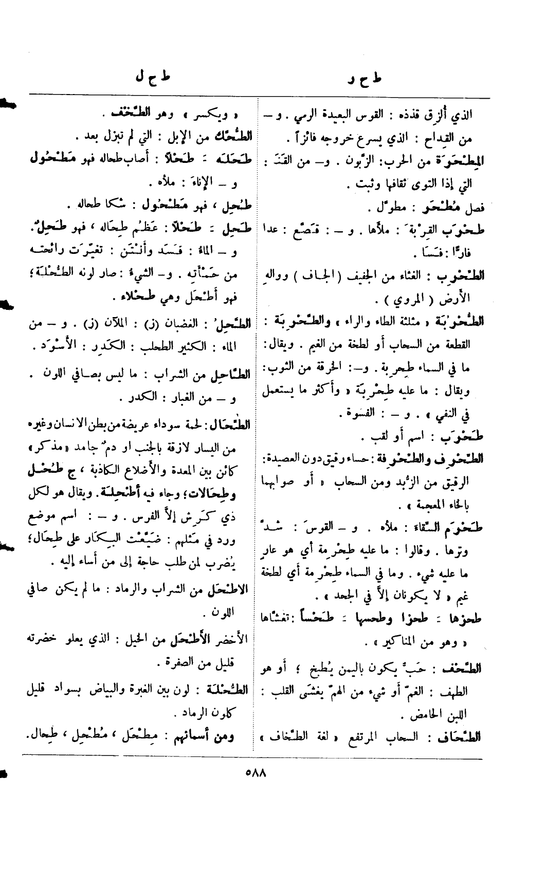 الطحل: الغضبان (ز): الملآن (ز). و- من الماء: الكثير الطحلب: الكدر: الأسود.