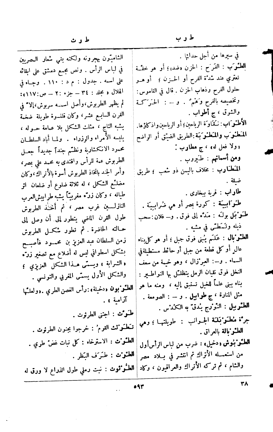 الشاميون يهجرونه ولكنه بقي شعار المصريين في لباس الرأس. ونص مجمع دمشق على ابقائه على اسمه. جدول: م د: 110. وجاء في الهلال "مجلد: 34 - جزء: 2 - ص: 117": لم يظهر الطربوش، وأصل اسمه سربوش، إلا في القرن السابع عشر، وكان قلنسوة طويلة ضخمة يشبه التاج، مثلث الشكل بلا عمامة حوله، يلبثه الأمراء والوزراء. ولما أباد السلطان محمود الانكشارية ونظم جندً جديدً جعل الطربوش عمة للرأس واقتدى به محمد علي بمصر، وأمر الجند باتخاذ الطربوش أسوة بالأتراك، وكان مضلع الشكل، له ثلاثة ضلوع أو ضلعان اثر طياته، وكان مغربيً يشبه طرابيش العرب النازلين غرب مصر، ثم أخذ الطربوش طول القرن الماضي يتطور إلى أن وصل إلى حالته الحاضرة. ثم تطور شكل الطربوش زمن السلطان عبد العزيز بن محمود فأصبح بشكل اسطواني ليس له أضلاع مع تصغير زره "الشرابة" ويسمى هذا الشكل العزيزي؛ والشكل الأول يسمى المغربي والتونسي.