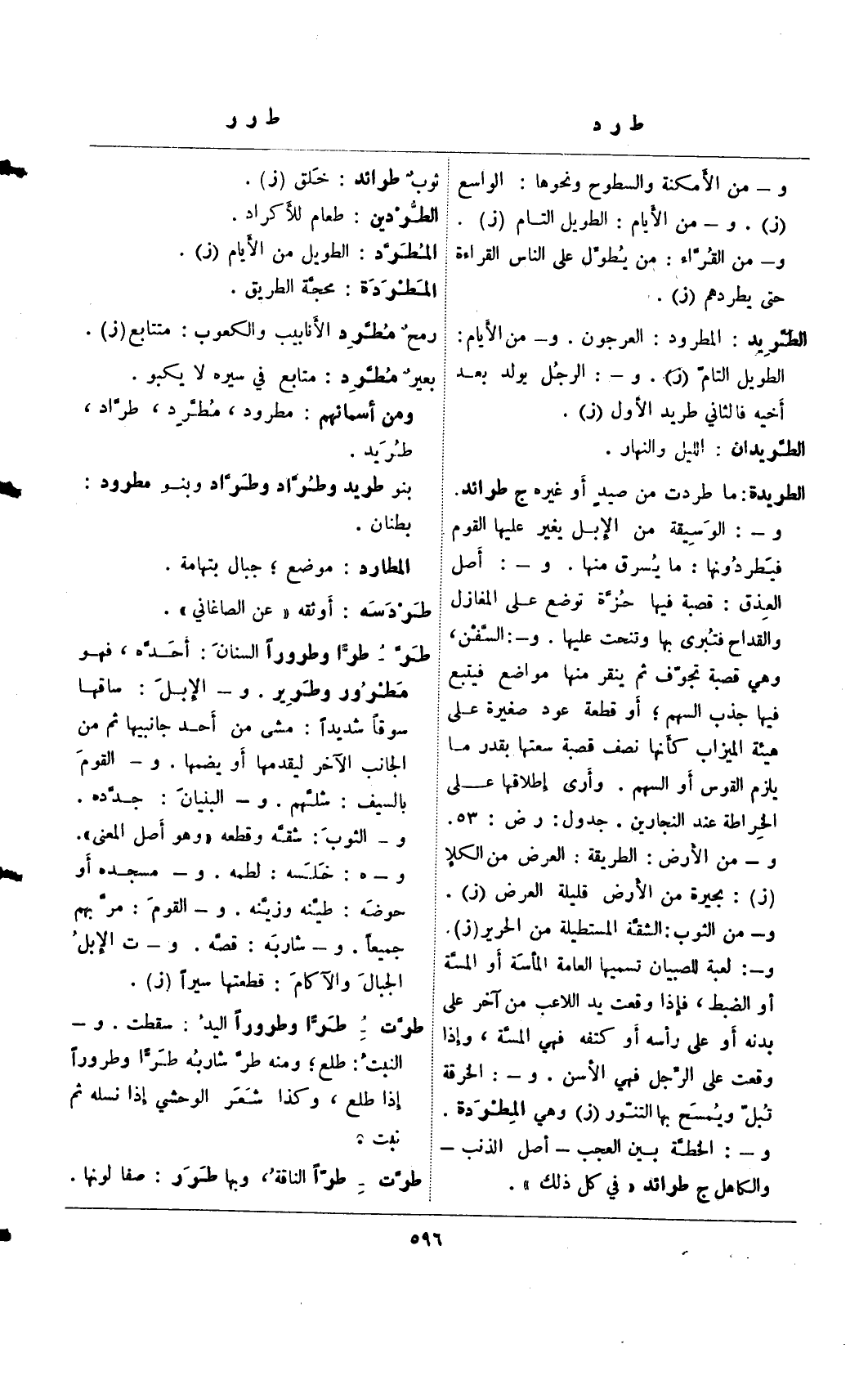 الطريدة: ما طردت من صيدٍ أو غيره ج طرائد. و-: الوسيقة من الإبل يغير عليها القوم فيطرودنها: ما يسرق منها. و-: أصل العذق: قصبة فيها حزة توضع على المغازل والقداح فتبرى بها وتنحت عليها. و-: السفن، وهي قصبة تجوف ثم ينقر منها مواضع فيتبع فيها جذب السهم؛ أو قطعة عود صغيرة على هيئة الميزاب كأنها نصف قصبة بقدر ما يلزم القوس أو السهم. وأرى إطلاقها على الخراطة عند النجارين. جدول: ر ض: 53. و- من الأرض: العرض من الكلا (ز): بحيرة من الأرض قليلة العرض (ز). و- من الثوب: الشقة المستطيلة من الحرير (ز). و-: لعبة للصبيان تسميها العامة المأسة أو المسة أو الضبط، فإذا وقعت يد اللاعب من آخر على بدونه أو على رأسه أو كتفه فهي المسة، وإذا وقعت على الرجل فهي الأسن. و-: الخرقة تبل ويمسح بها التنور (ز) وهي المطردة. و-: الخطة بين العجب– أصل الذنب- والكاهل ج طرائد " في كل ذلك".