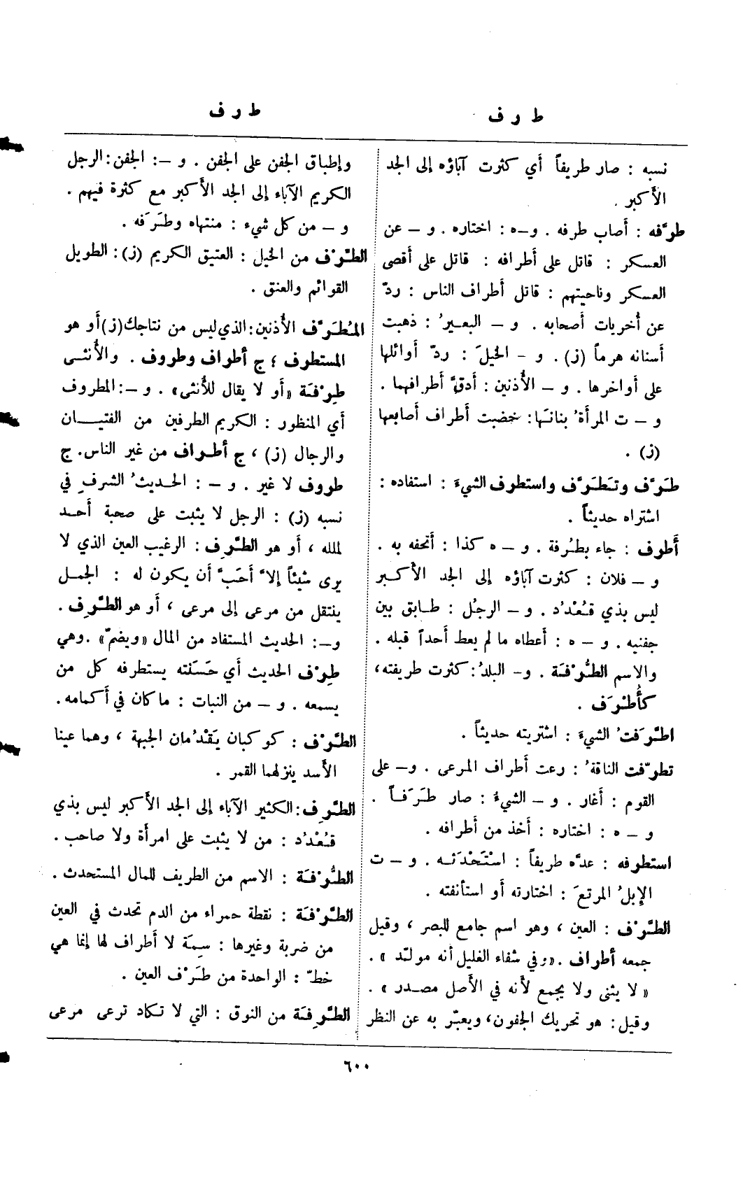 نسبه: صار طريفًا أي كثرت آباؤه على الجد الأكبر. طرفه: أصاب طرفه. و-هـ: اختاره. و- عن العسكر: قاتل على أطرافه: قاتل على أقصى العسكر وناحيتهم: قاتل أطراف الناس: رد عن أخريات أصحابه. والبعير: ذهبت أسنانه هرمًا (ز). و- الخيل: رد أوائلها على أواخرها. و- الأذنين: أدق أطرافهما. و-ت المرأة بنانها: خضبت أطراف أصابعها (ز).